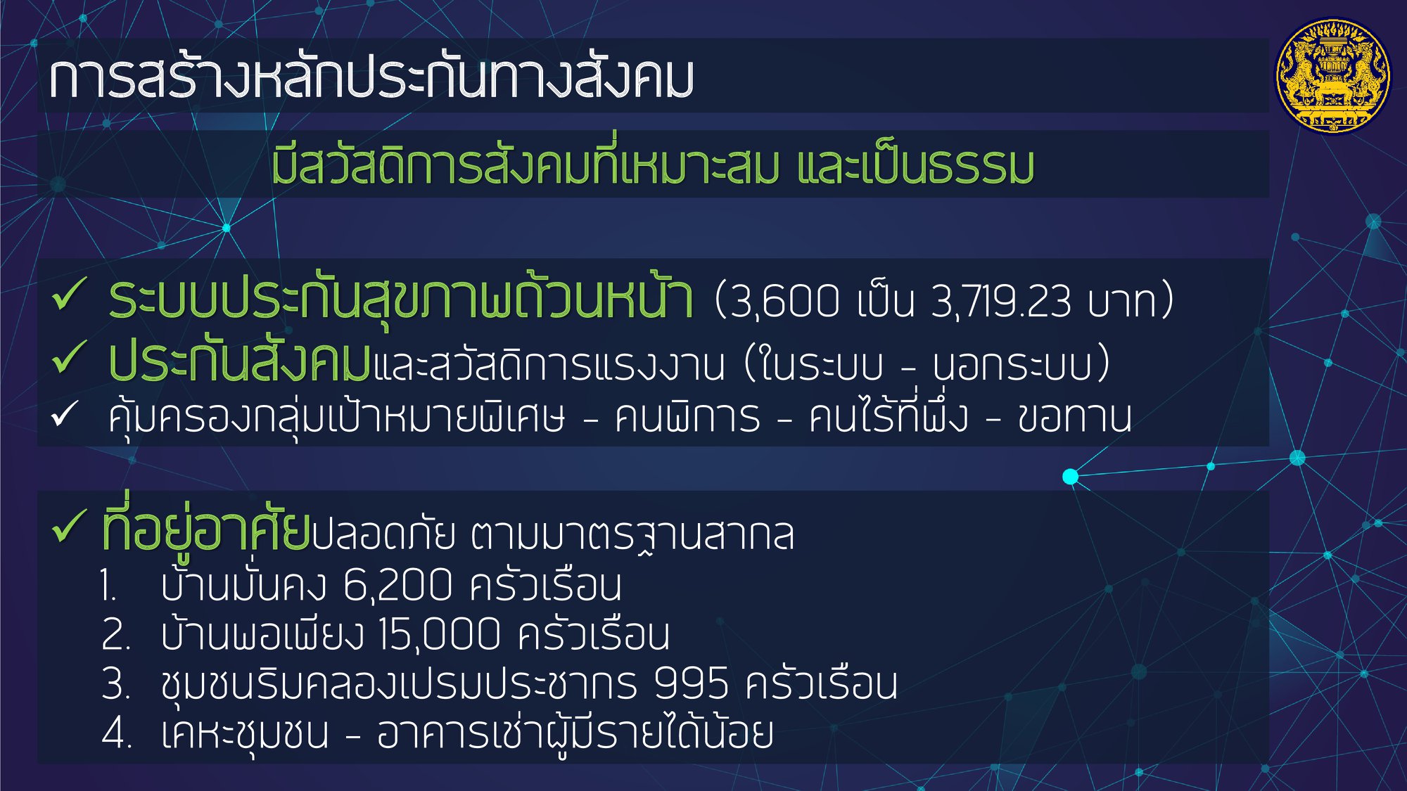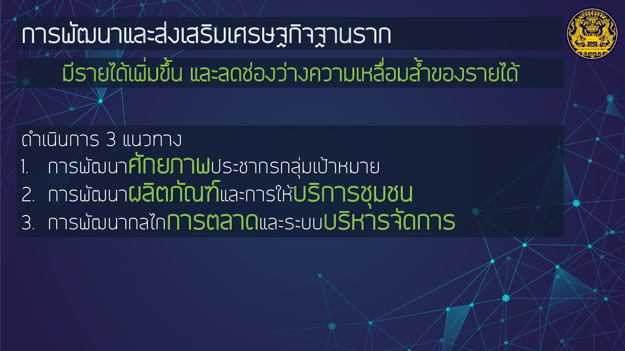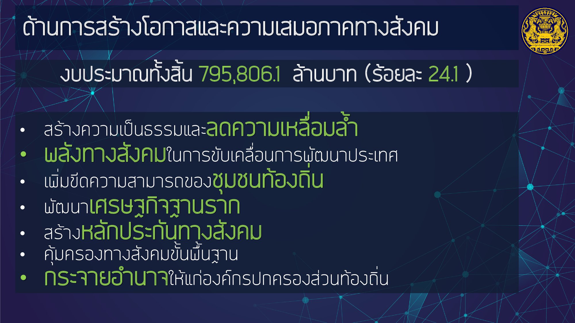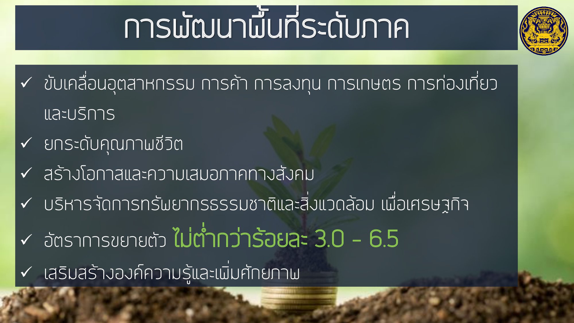 โดยให้ความสำคัญกับการฟื้นฟูเศรษฐกิจ และคุณภาพชีวิตของประชาชนที่ได้รับผลกระทบจากสถานการณ์การระบาดของโรคติดเชื้อไวรัสโคโรนา 2019 ควบคู่ไปกับส่งเสริมการสร้างรายได้ของประชาชนเพื่อกระจายผลประโยชน์ทางเศรษฐกิจอย่างเป็นธรรมและทั่วถึง