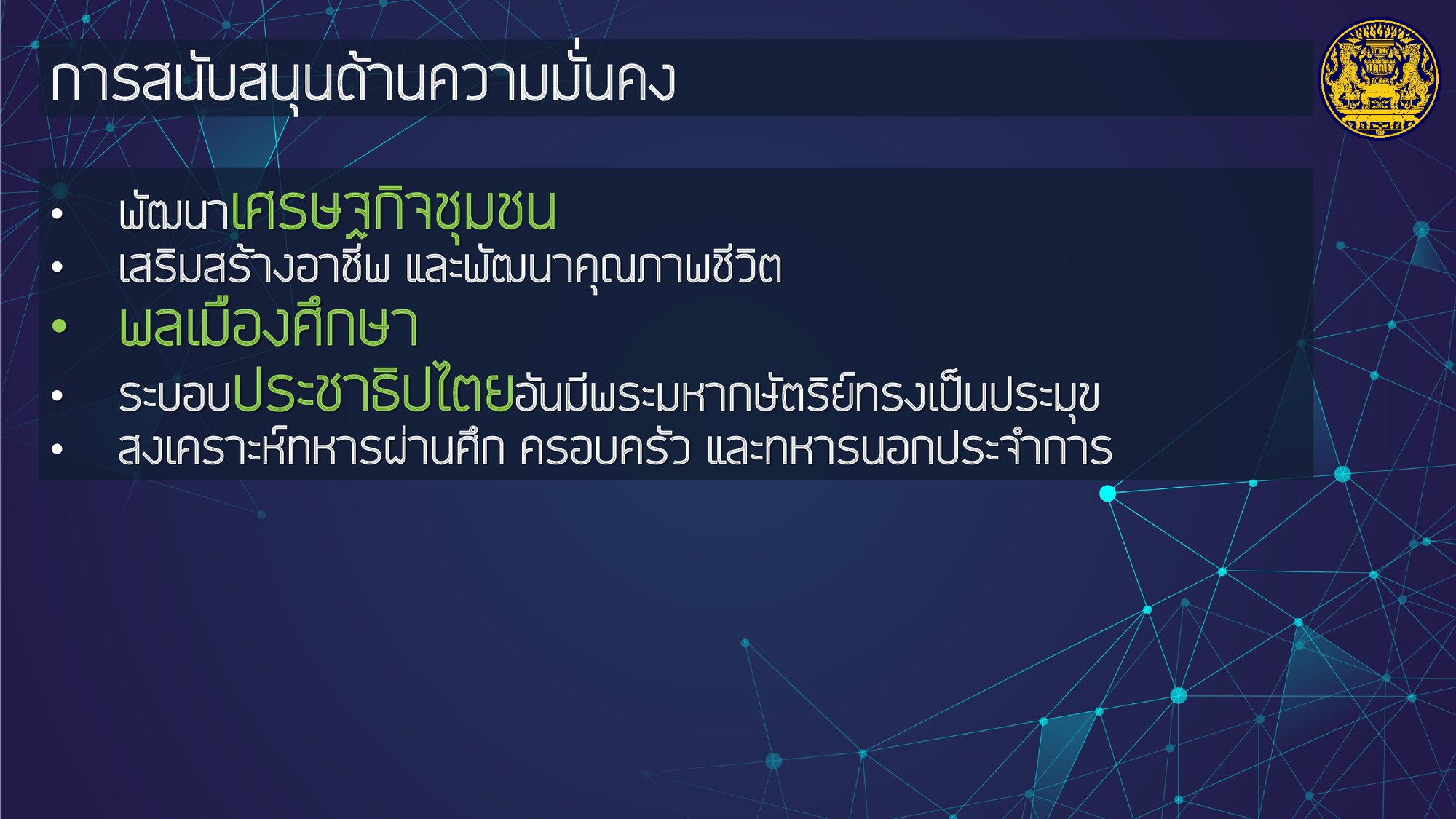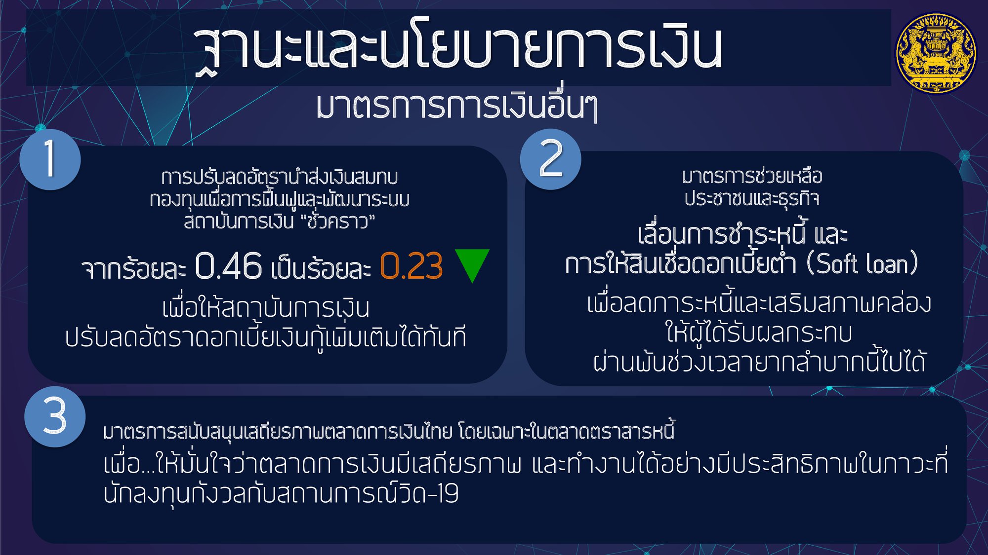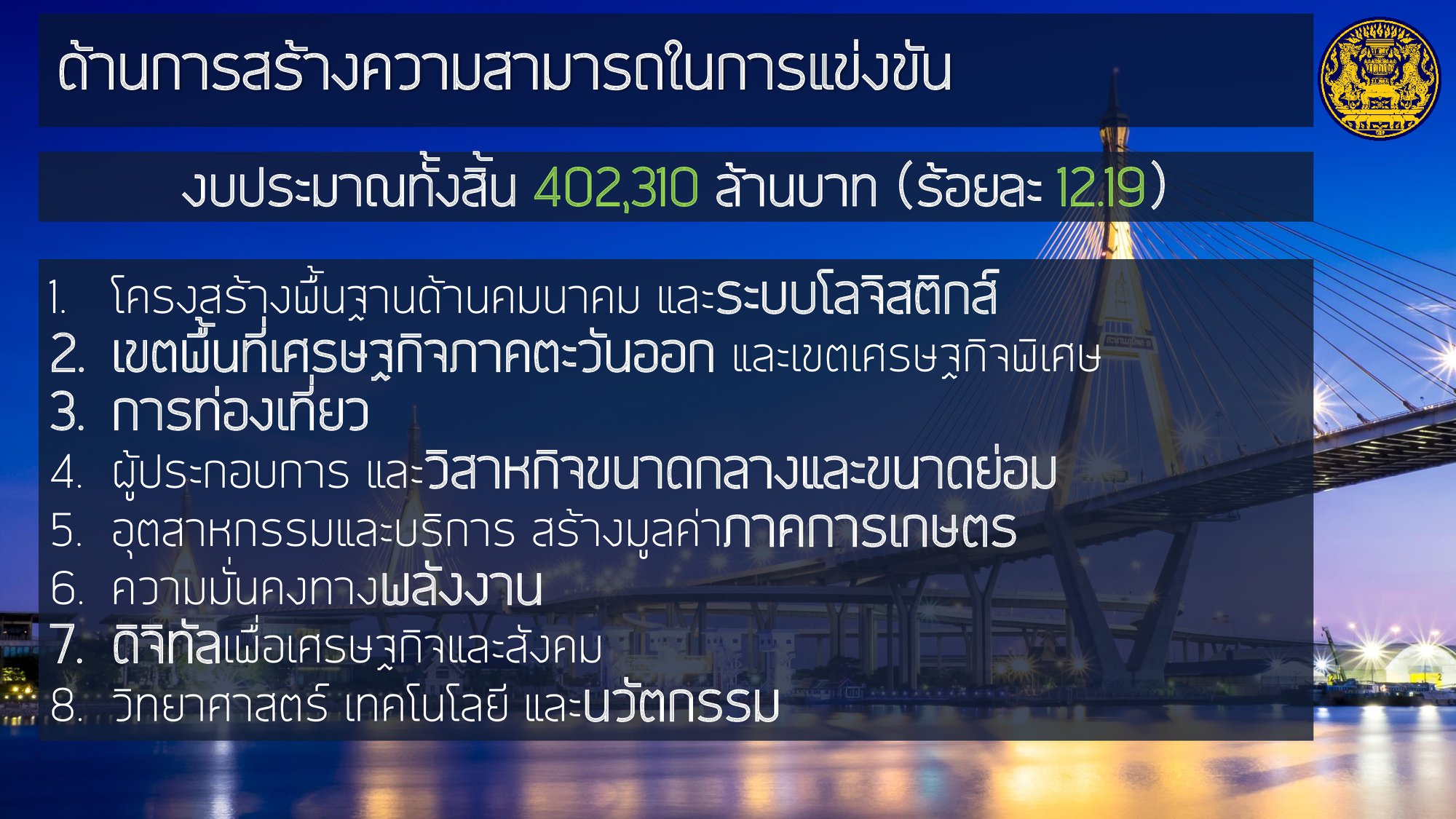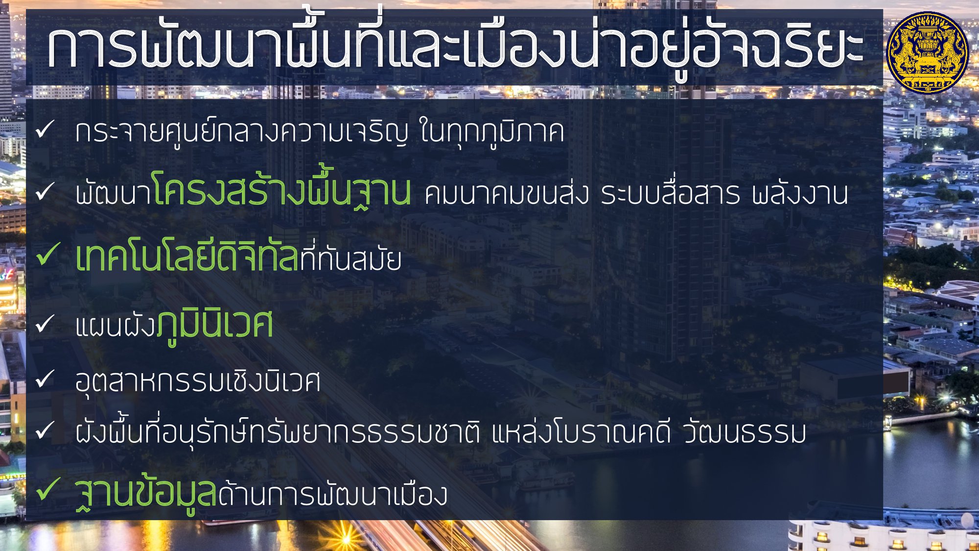 โดยให้ความสำคัญกับการฟื้นฟูเศรษฐกิจ และคุณภาพชีวิตของประชาชนที่ได้รับผลกระทบจากสถานการณ์การระบาดของโรคติดเชื้อไวรัสโคโรนา 2019 ควบคู่ไปกับส่งเสริมการสร้างรายได้ของประชาชนเพื่อกระจายผลประโยชน์ทางเศรษฐกิจอย่างเป็นธรรมและทั่วถึง