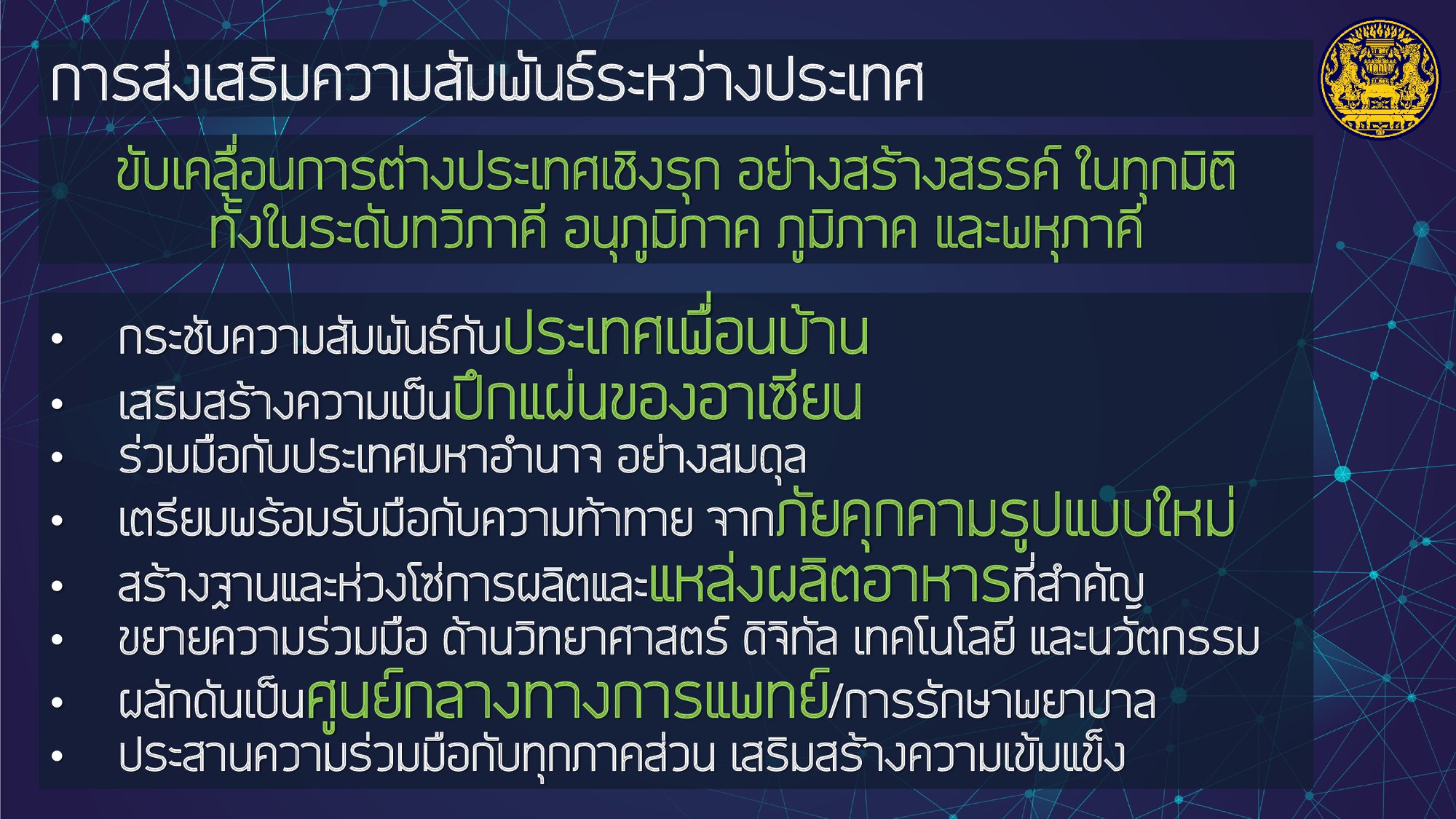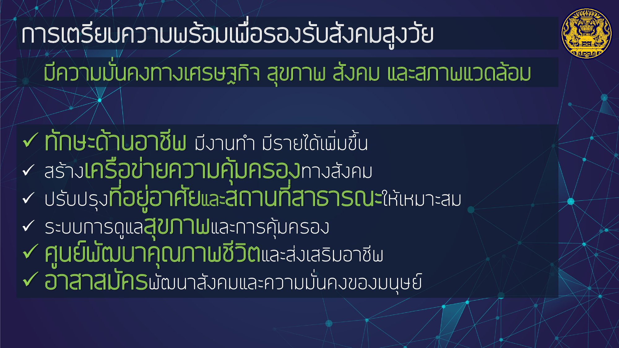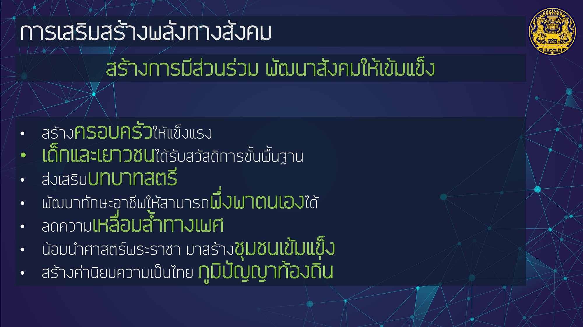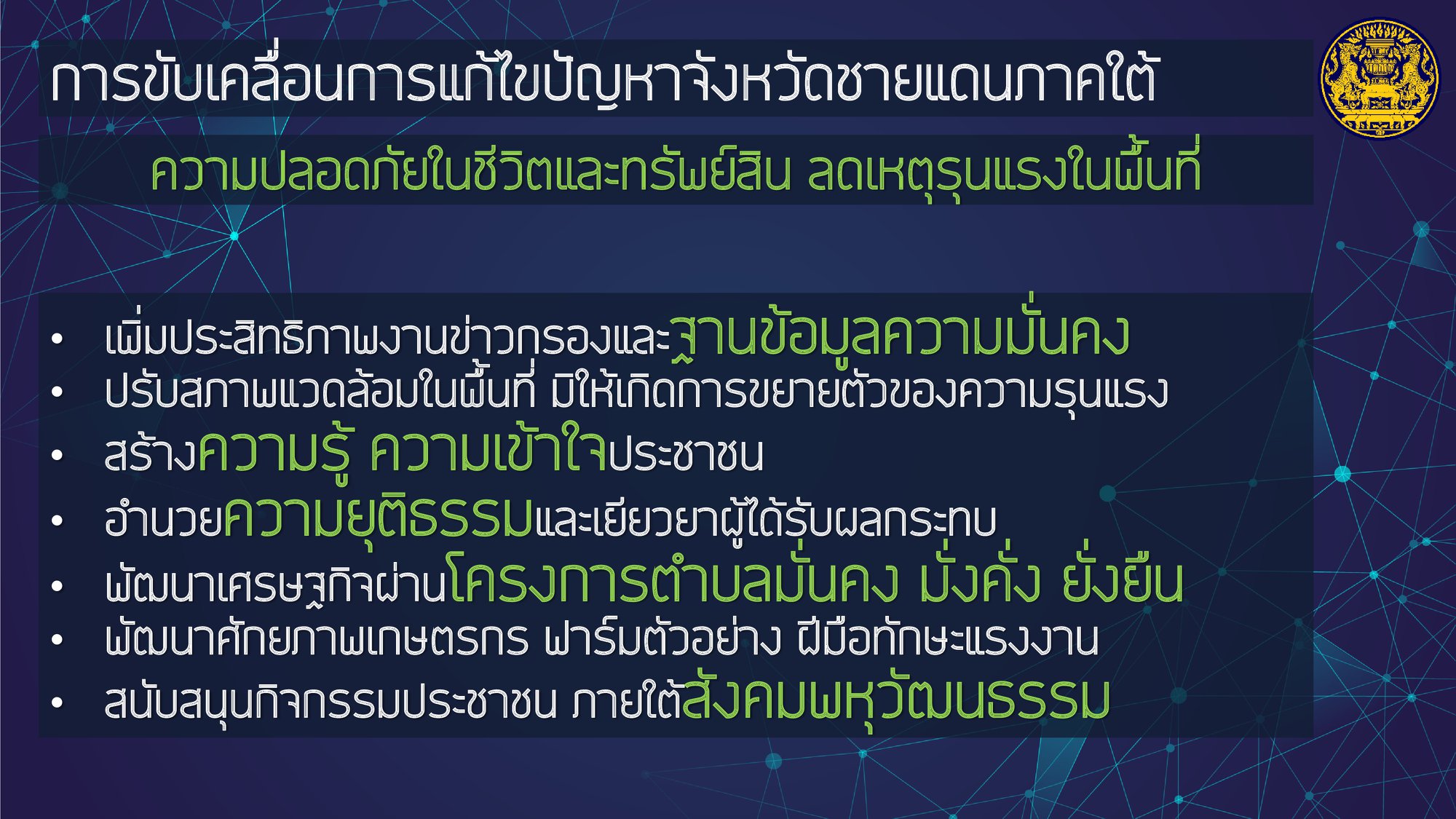 โดยให้ความสำคัญกับการฟื้นฟูเศรษฐกิจ และคุณภาพชีวิตของประชาชนที่ได้รับผลกระทบจากสถานการณ์การระบาดของโรคติดเชื้อไวรัสโคโรนา 2019 ควบคู่ไปกับส่งเสริมการสร้างรายได้ของประชาชนเพื่อกระจายผลประโยชน์ทางเศรษฐกิจอย่างเป็นธรรมและทั่วถึง