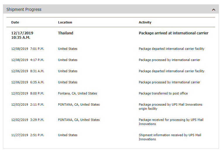 แต่ของมาถึงไทยประมาณปลายปีที่แล้ว ปล.อันนี้เป็นภาพล่าสุดที่แคปมาก่อนที่ไม่สามารถเช็คข้อมูลเลข Tracking ได้
