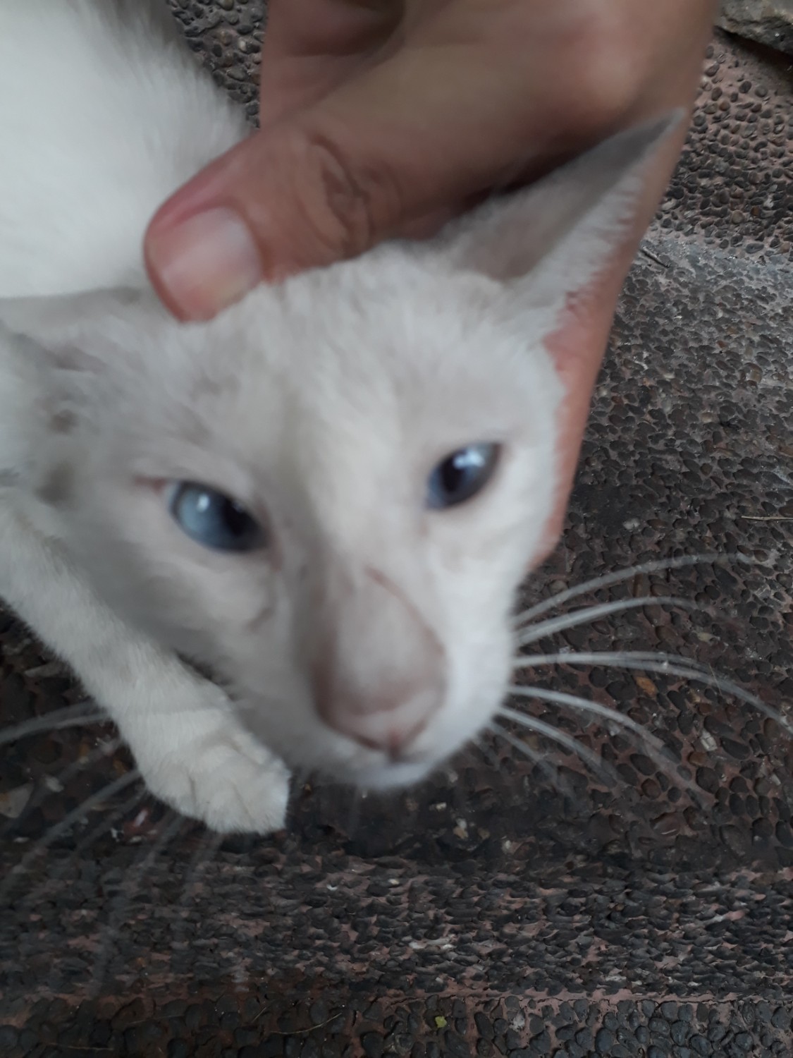 น้องตัวสีขาวหางเรียวยาวตาสีฟ้า แต่มีสีส้มปนมาค่ะ ดูจากในรูปที่หางหาของน้องจะมีลายสีส้มปนอยู่ แล้วก็ที่หูสองข้างค่ะ ไปอ่านในเน็ตมาเขาบอกว่ามันเป็นลักษณะด้อยของน้