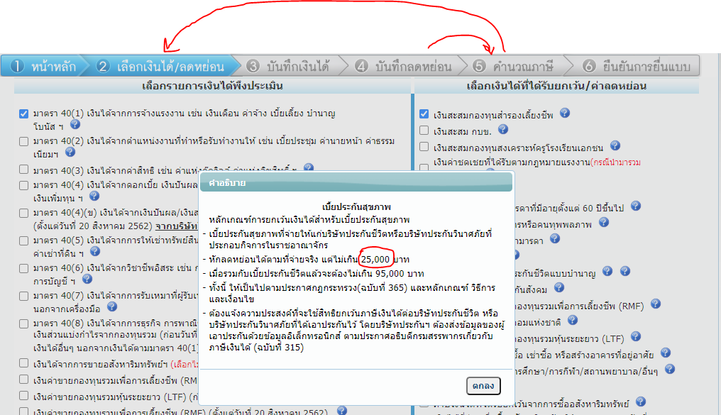 รูปที่ 3 กด Next จนถึงขั้นตอนที่ 5 ให้มันแสดงภาษี แล้วกดไปเข้าขั้นตอนที่ 2 ใหม่ แล้วกด ? หลังไอเท่มเบี้ยประกันสุขภาพ (หน้าเดียวกับรูปที่ 1)