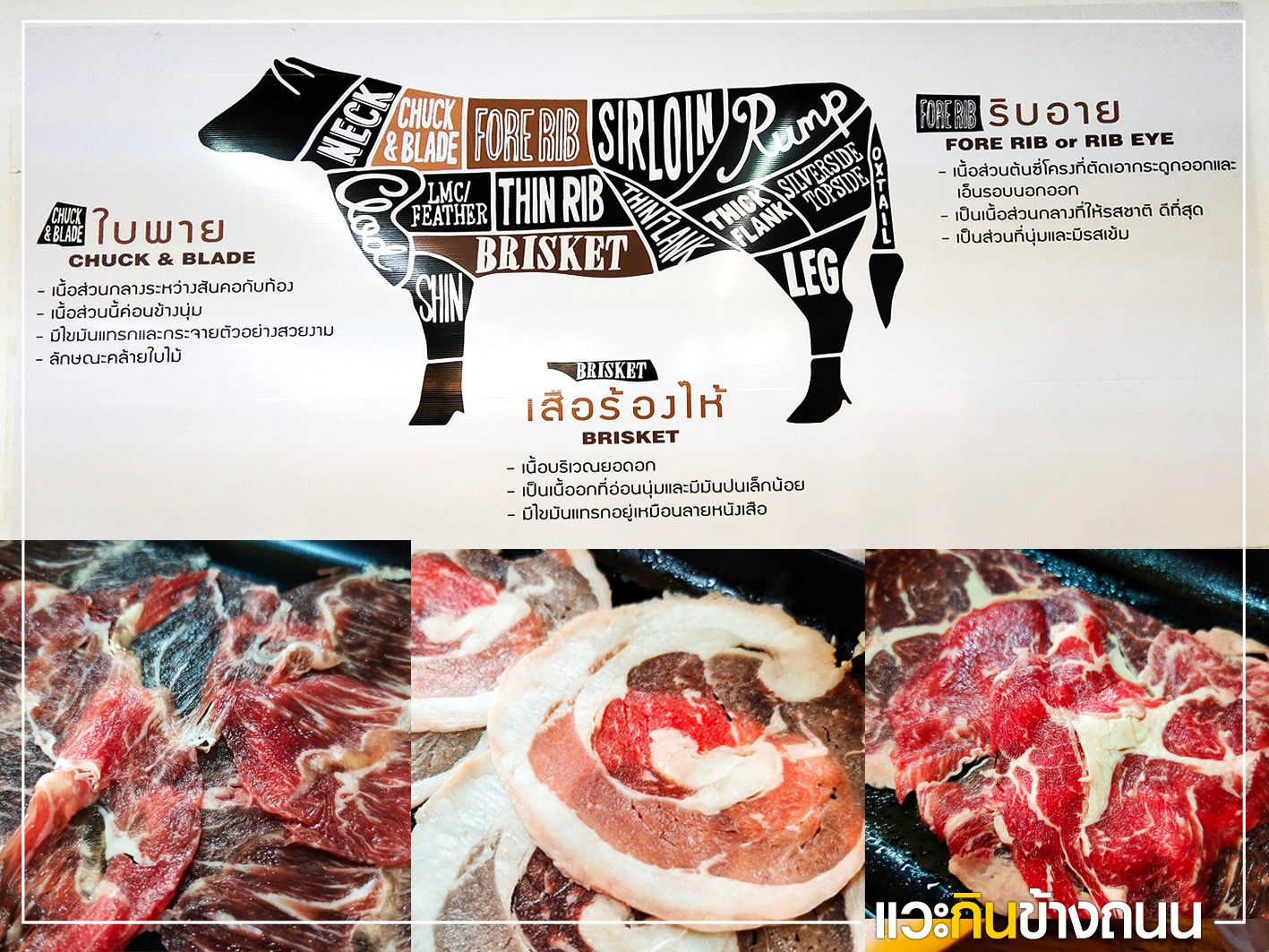 1. เสือร้องไห้ (Brisket) 🥩 : เนื้อติดมัน บริเวณอกและท้อง ลักษณะเนื้อจะมีไขมันพาดยาวตลอดเส้น เป็นส่วนที่อร่อยเลยทีเดียว