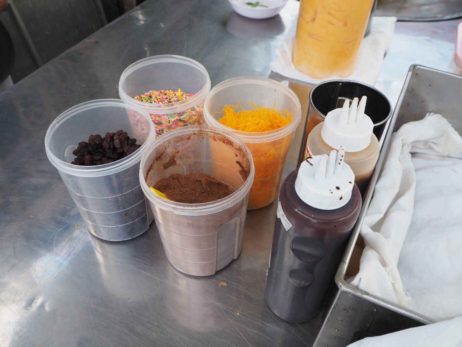 มี ลูกเกด เม็ดน้ำตาลสีๆ ฝอยทอง โอวัลติน ซอสช็อคโกแลท ซอสคาราเมล ค่ะ