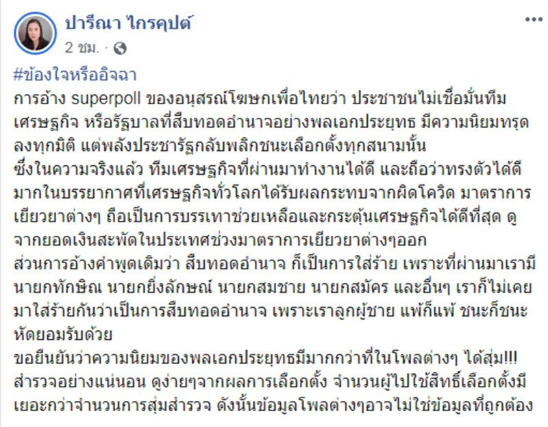 โดยระบุว่า ข้องใจหรืออิจฉา การอ้าง superpoll ของอนุสรณ์ โฆษกเพื่อไทยว่า ประชาชนไม่เชื่อมั่นทีมเศรษฐกิจ หรือรัฐบาลที่สืบทอดอำนาจอย่างพลเอกประยุทธ์ มีความนิยมทรุดลงทุกมิติ แต่พลังประชารัฐกลับพลิกชนะเลือกตั้งทุกสนามนั้น