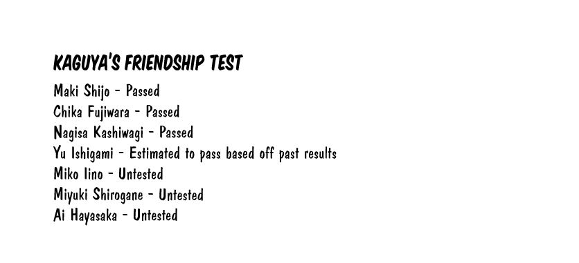 คากูยะไม่ได้ทดสอบเรื่องเพื่อนกับ มิยูกิ แฮะ, ฮายาซากะหลายคนคงรูแล้ว ส่วนอิโนะ คากูยะคงไม่สนใจ (อิชิกามิผ่านเพราะเรื่องในอดีต)
