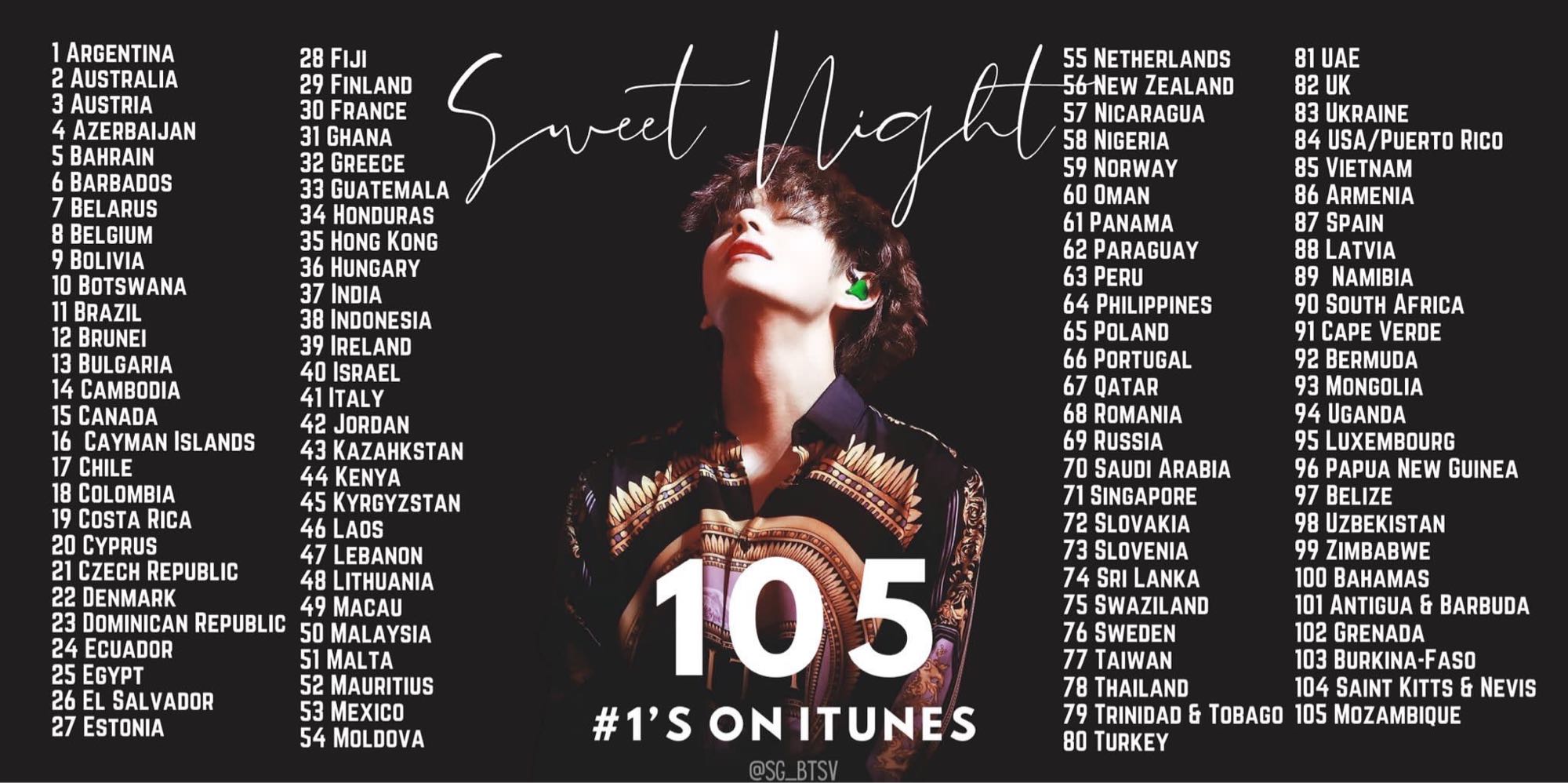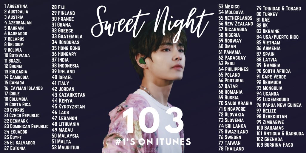 เพลง 'Sweet Night' ของ V กลายเป็นเพลงที่ขึ้นอันดับ #1 บน iTunes มากที่สุดในโลก ถึง 103 ประเทศ ทำลายสถิติเพลง Hello ของ Adele ที่ทำไว้ 102 ประเทศเมื่อ 5 ปีที่แล้วลงเรียบร้อย