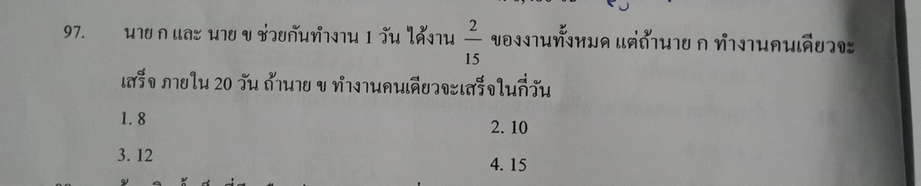 1 วัน ก+ข ทำงานได้ = 2/15 ของงานทั้งหมด