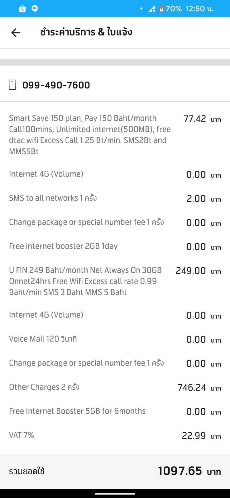 ผมใช้ดีแทครายเดือน 150 บาท แต่บิลมา1097บาท ค่าother charges 746 บาท คือค่าบริการอะไรไม่รู้ครับ555 ตอนจะใช้เบอร์นี้ก็ไม่ได้ตั้งใจใช้ครับ แต่มีเซลล์มาตื้อหนักมาก เลยลองทนใช้ๆไป พอเจออย่างงี้คงต้องเลิกใช้ครับ แต่แค่อยากรู้ว่าค่าบริการอะไรแพงมาก5555 มีท่ารนใดเคยเจอค่าบริการนี้ไหมครับ