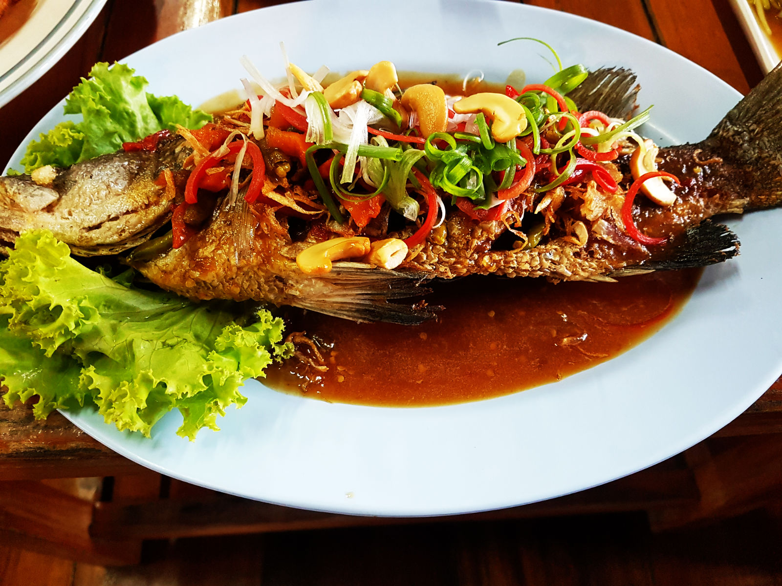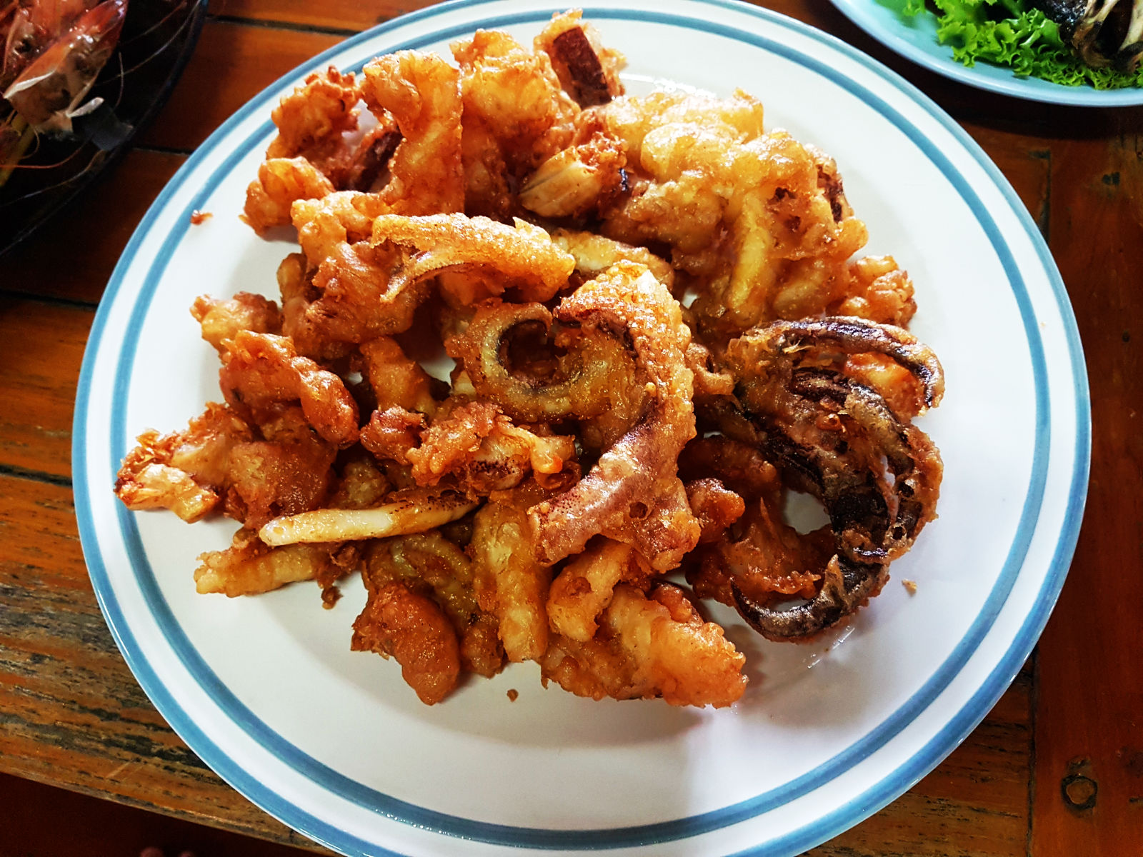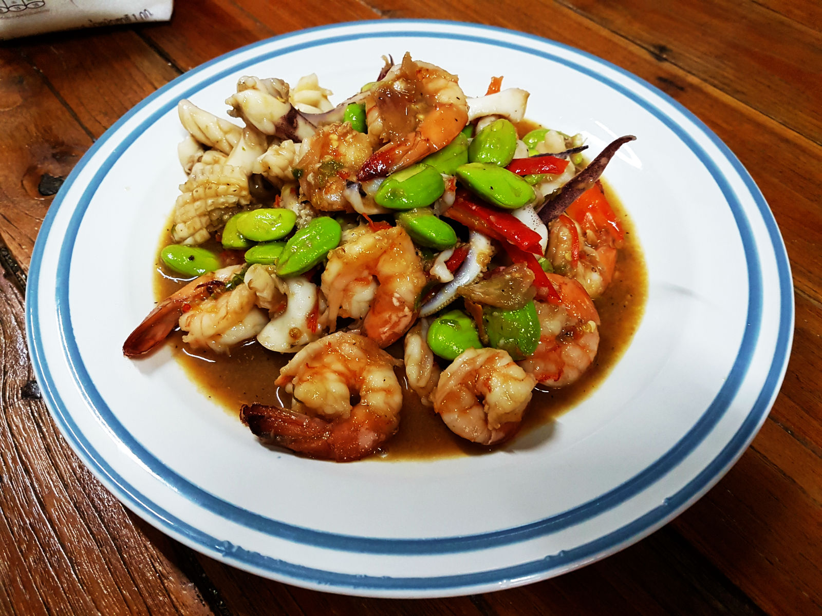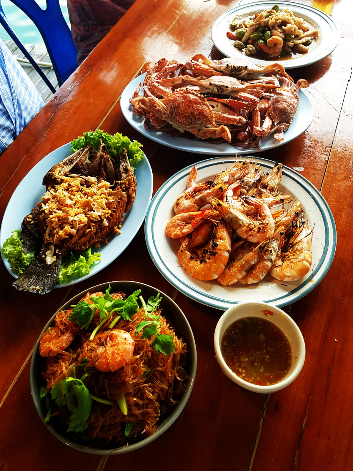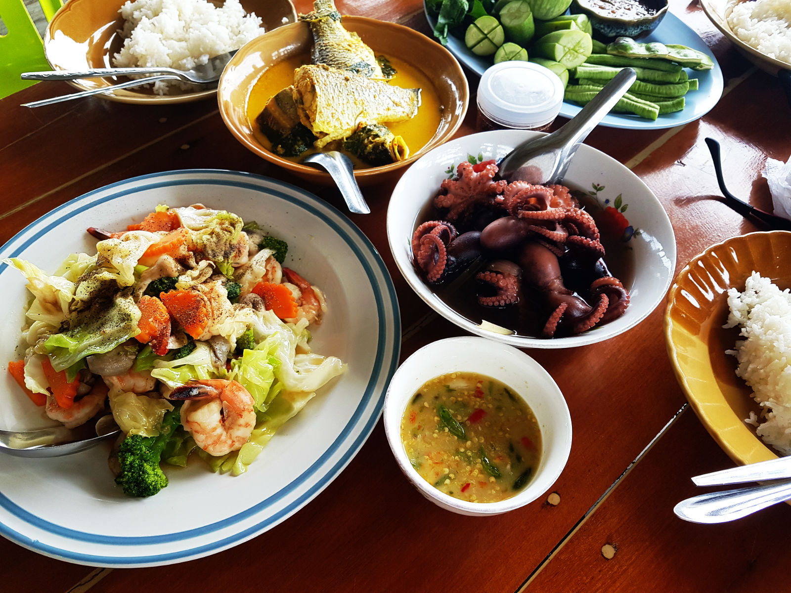 ปลาหมึกที่นี่อร่อยจริงๆ ชุบแป้งทอด จานเด่นของมื้อนี้คือ แกงส้มใต้ปลาโฉมงาม เพิ่งเคยกินครั้งแรก ปลาโฉมงาม ชาวบ้านบอกแถวนี้พอหาได้ หลังจากอิ่มแล้วรอเวลาไปตกปลาหมึกตอน 20.00 น.