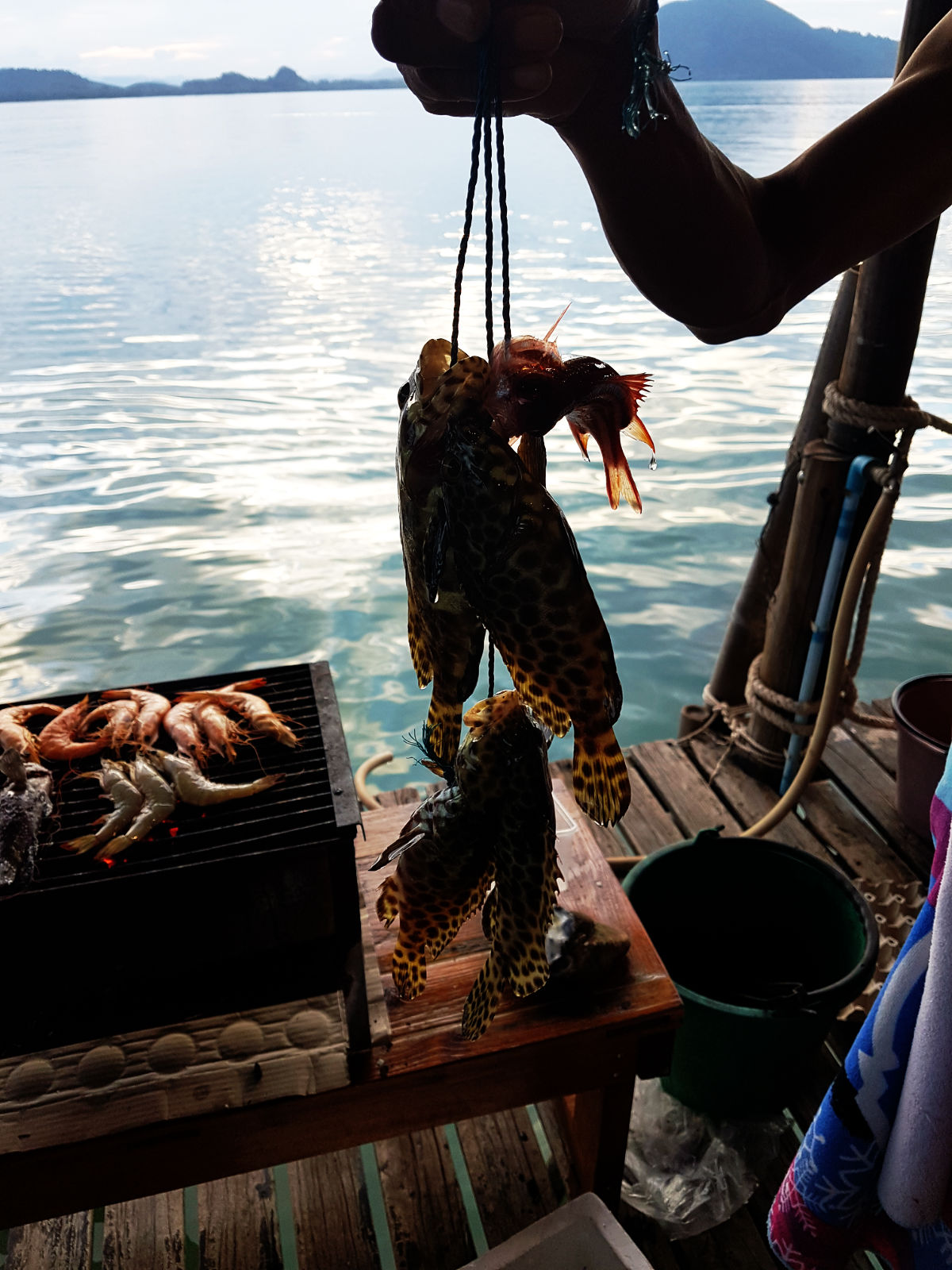 สายตกปลาก็นั่งตกกันไป ปลามีหลายชนิดครับ ได้ปลาเก๋าหลายตัว เริ่มย่างกุ้งและทำกั้งที่ได้มา ดองน้ำปลา สดจริง อร่อยจริงครับ