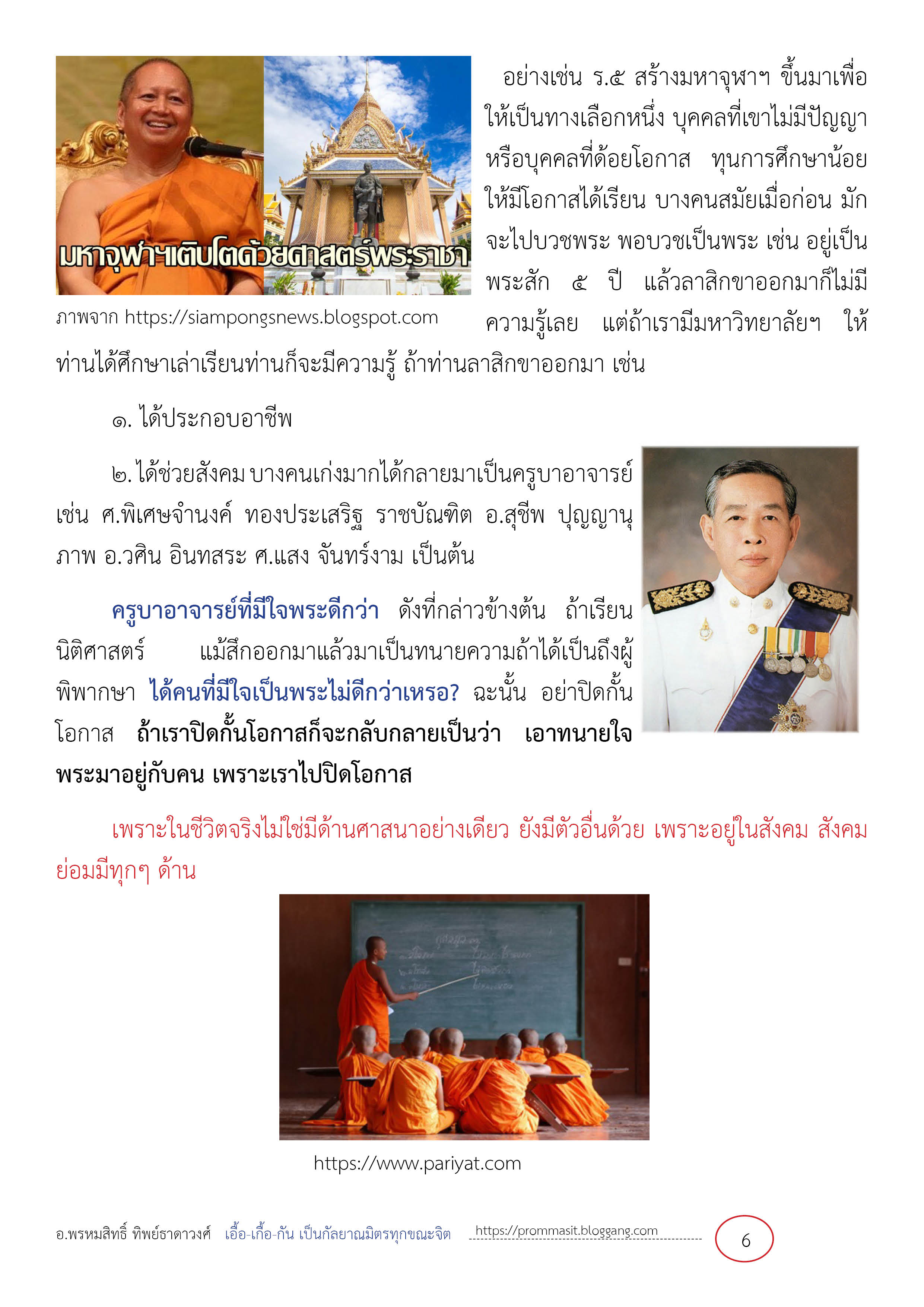 อย่างเช่น ร.๕ สร้างมหาจุฬาฯ ขึ้นมาเพื่อให้เป็นทางเลือกหนึ่ง บุคคลที่เขาไม่มีปัญญา หรือบุคคลที่ด้อยโอกาส ทุนการศึกษาน้อย ให้มีโอกาสได้เรียน บางคนสมัยเมื่อก่อน มักจะไปบวชพระ พอบวชเป็นพระ เช่น อยู่เป็นพระสัก ๕ ปี แล้วลาสิกขาออกมาก็ไม่มีความรู้เลย แต่ถ้าเรามีมหาวิทยาลัยฯ ให้ท่านได้ศึกษาเล่าเรียนท่านก็จะมีความรู้ ถ้าท่านลาสิกขาออกมา เช่น