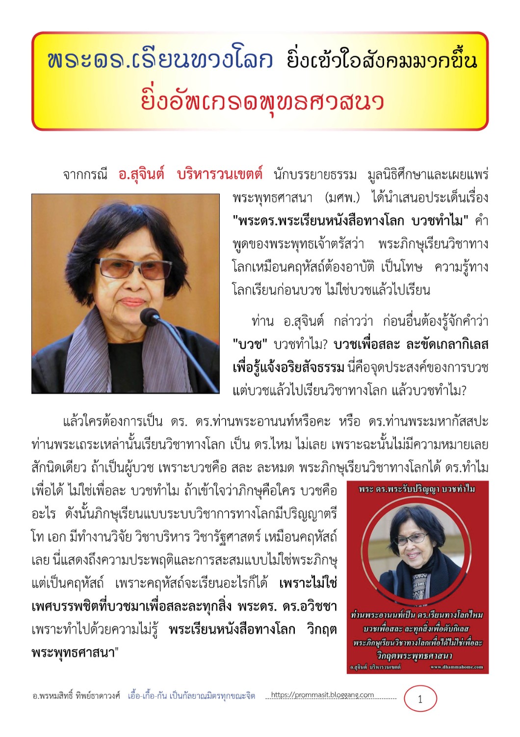 สำหรับคุณยาย อ.สุจินต์ บริหารวนเขตต์ พูดมานั้นก็ถูกอยู่ แต่เข้าใจไม่ครบ คือ ณ เวลานี้ ยุคสมัยนี้วงการการศึกษาได้เปิดกว้างขึ้น คือ เปิดโอกาสสำหรับคนที่ไม่มีโอกาสได้รับโอกาสให้ได้เรียนระดับปริญญามากขึ้น พอเรียนแล้วถึงจุดหนึ่ง มีเหตุจำเป็นที่จะไปเป็นฆราวาสแล้ว ท่านก็จะได้มีพื้นฐาน มีความรู้ติดตัวไปอยู่ทางโลก แต่ไม่ใช่ว่าท่านใฝ่ฝันปรารถนาเรียนจบแล้วจะมาอยู่ทางโลก