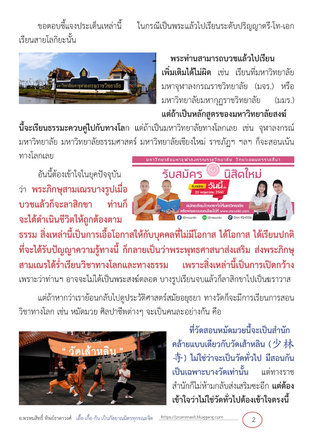 พระท่านสามารถบวชแล้วไปเรียนเพิ่มเติมได้ไม่ผิด เช่น เรียนที่มหาวิทยาลัยมหาจุฬาลงกรณราชวิทยาลัย (มจร.) หรือมหาวิทยาลัยมหากุฏราชวิทยาลัย (มมร.) แต่ถ้าเป็นหลักสูตรของมหาวิทยาลัยสงฆ์นี้จะเรียนธรรมะควบคู่ไปกับทางโลก แต่ถ้าเป็นมหาวิทยาลัยทางโลกเลย เช่น จุฬาลงกรณ์มหาวิทยาลัย มหาวิทยาลัยธรรมศาสตร์ มหาวิทยาลัยเชียงใหม่ ราชภัฏฯ ฯลฯ ก็จะสอนเน้นทางโลกเลย