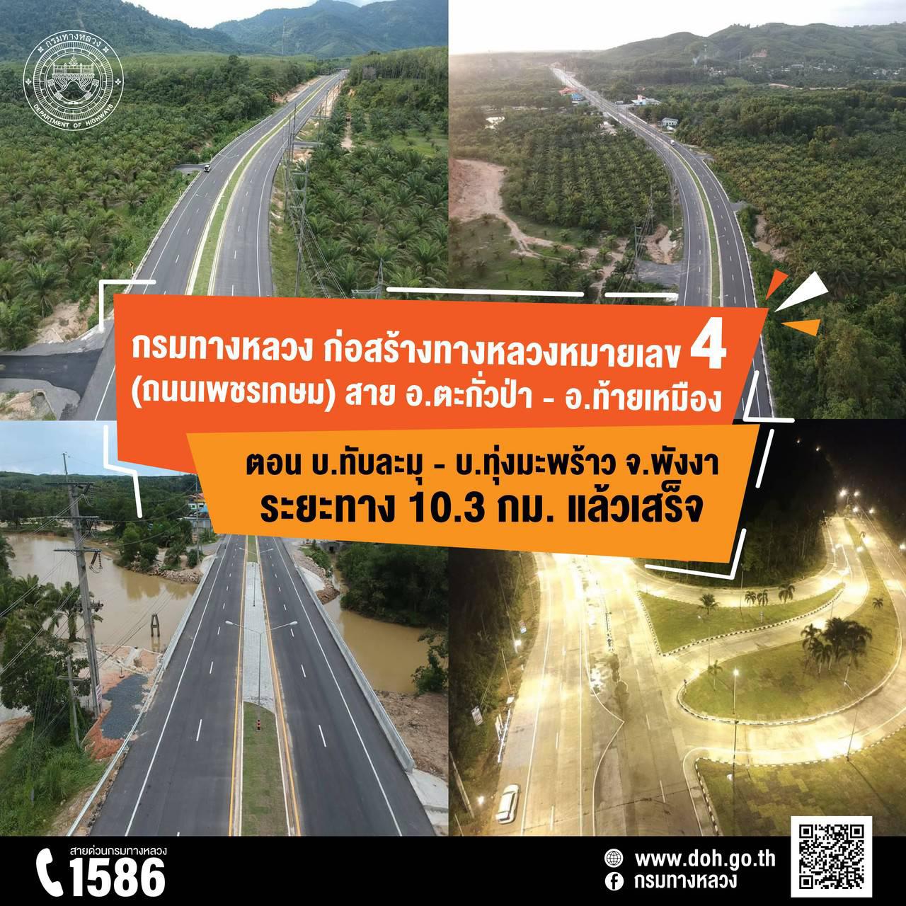 📌กรมทางหลวง โดยสำนักก่อสร้างทางที่ 1 ได้ดำเนินการควบคุมการก่อสร้างทางหลวงหมายเลข 4 สาย อ.ตะกั่วป่า - อ.ท้ายเหมือง ตอน บ.ทับละมุ - บ.ทุ่งมะพร้าว โดยมีจุดเริ่มต้นโครงการฯ ที่ กม.803 และมีจุดสิ้นสุดโครงการฯ ที่กม.813+300 มีระยะทางประมาณ 10.300 กิโลเมตร มาตรฐานชั้นทางพิเศษ ขนาด 4 ช่องจราจร ไป - กลับ ผิวทางเป็น Asphalt Concrete แบ่งทิศทางจราจรด้วยเกาะกลางแบบถมดิน (Raised Median) รวมงานติดตั้งไฟฟ้าแสงสว่างบนทางหลวง และไฟกระพริบบนทางหลวง เส้นทางตอนนี้อยู่ในพื้นที่ บ.ลำแก่น อำเภอท้ายเหมือง และ บ.ทุ่งมะพร้าว อำเภอท้ายเหมือง จังหวัดพังงา