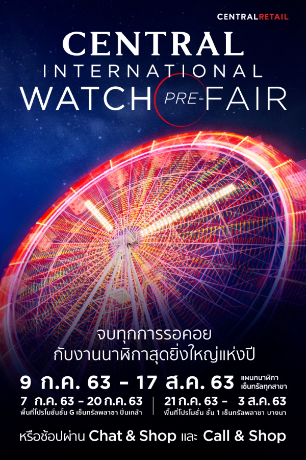 ห้างเซ็นทรัล เอาใจสาวกคนรักเรือนเวลา ขนทัพนาฬิกาแบรนด์ดังระดับโลก จัดรายการ “เซ็นทรัล อินเตอร์เนชั่นแนล วอทช์ พรี-แฟร์ 2020” (Central International Watch PRE-Fair 2020) ตอบโจทย์ทุกไลฟ์สไตล์ให้บรรดาวอทช์เลิฟเวอร์ และคอลเลกเตอร์ได้จับจองเป็นเจ้าของ ระหว่างวันที่ 9 ก.ค.- 17 ส.ค. 63 พร้อมโปรโมชั่นส่วนลดสูงสุด 70 % และรับส่วนลดเพิ่มอีกสูงสุด 135,000 บาท เมื่อช้อปครบตามเงื่อนไข ลด/รับเพิ่มอีกสูงสุด 32 % จาก The 1 และบัตรเครดิตที่ร่วมรายการ พร้อมโหลดรับฟรี!! LINE คูปองส่วนลดแทนเงินสด มูลค่าสูงสุด 1,500 บาท เมื่อซื้อนาฬิกามูลค่า 10,000 บาทขึ้นไป โดยสามารถดาวน์โหลดคูปองได้ที่แอปพลิเคชั่นไลน์ Central Department Store นอกจากนี้ยังสามารถรับสิทธิ์ผ่อนชำระ 0% นาน 10 เดือน จากบัตรเครดิตชั้นนำ ระหว่างวันที่ 9 ก.ค - 17 ส.ค. 63 ที่แผนกนาฬิกา ห้างเซ็นทรัลทุกสาขา และพื้นที่โปรโมชั่น ชั้น G ศูนย์การค้าเซ็นทรัลพลาซา ปิ่นเกล้า วันที่ 7 - 20 ก.ค. 63, พื้นที่โปรโมชั่น ชั้น 1 ศูนย์การค้าเซ็นทรัลพลาซา บางนา วันที่ 21 ก.ค. - 3 ส.ค. 63 หรือช้อปผ่าน Central Chat & Shop ผ่านแชตบนแอปพลิเคชั่น Line เพียงแอด @CENTRALOFFICIAL และ Central Call & Shop โทร. 1425 (10:00 – 20:00)