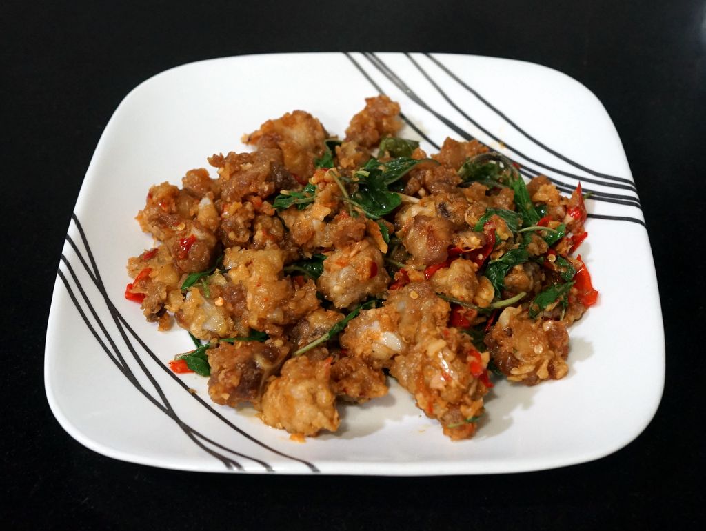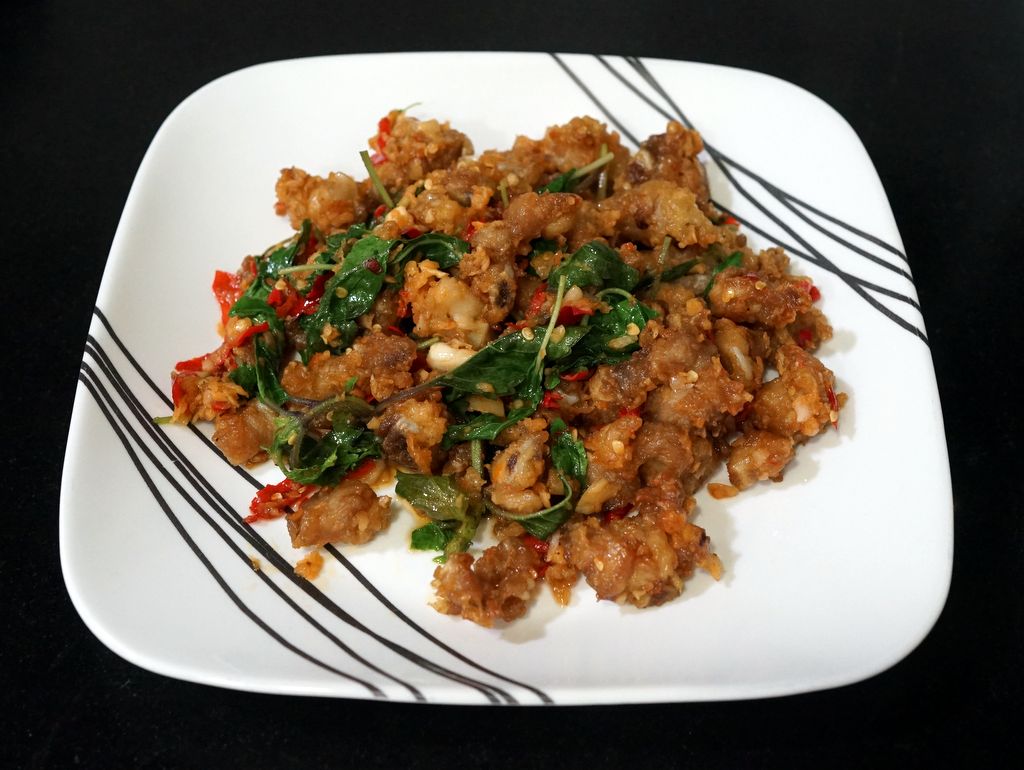 ข้อไก่ นำไปคลุกแป้งบางๆ เอาไปทอด แล้วเอาไปผัดกะเพรา