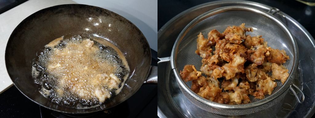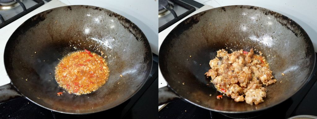 พริกขี้หนูกระเทียมตำหยาบๆ นำไปผัดกับน้ำมันหมูจนหอม ใส่ข้อไก่ทอดลงไป