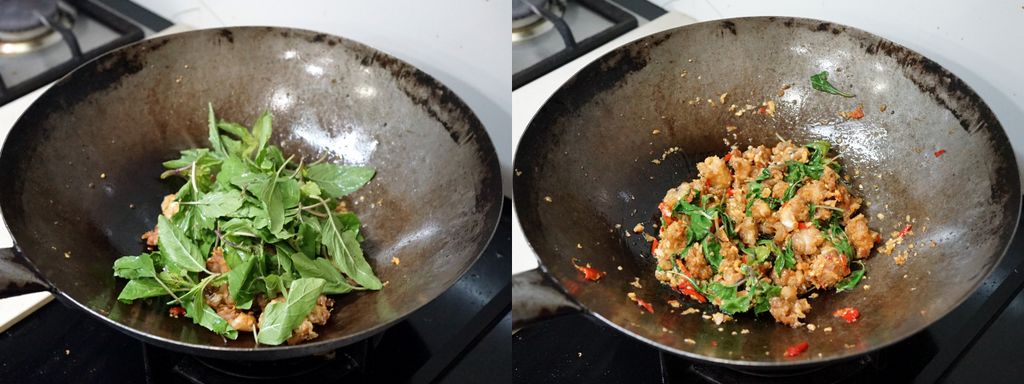 ผัดให้เข้ากัน ปรุงรสด้วยน้ำปลา เหล้าจีน ใส่ใบกะเพรา ผัดให้เข้ากัน