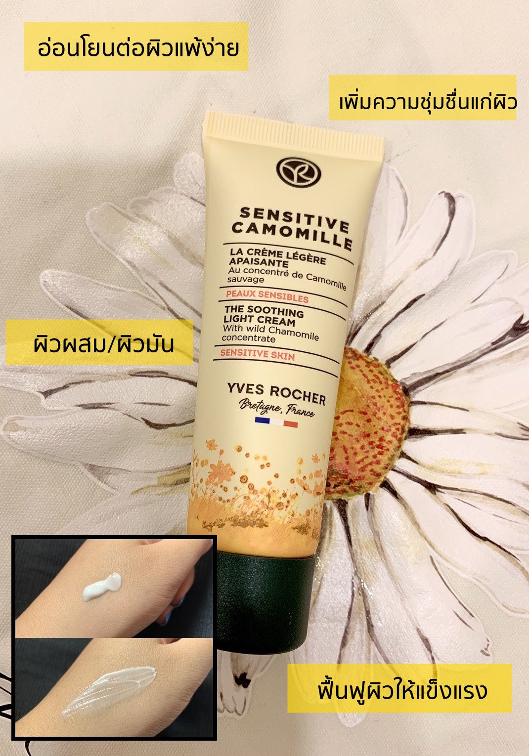 Sensitive Camomille the Soothing Light Cream ตัวนี้จะเป็นไลท์ครีม ที่เราเน้นใช้ก่อนนอน (Night Cream) ชื่อก็บ่งบอกแล้วว่าไลท์ คือมันเบาบางจริงๆ เนื้อครีมจะเป็นสีขาวเนียนๆ ทาง่าย เกลี่ยง่าย บางเบามาก ตัวนี้เมื่อใช้คู่กันกับครีมเขียวคาโมมายล์ คือยิ่งช่วยทำให้หน้าชุ่มชื้นและผิวแข็งแรงขึ้นอย่างต่อเนื่องแบบฟูลสตรีม แล้วก็บังช่วยปรับสีผิวให้สม่ำเสมออย่างเป็นธรรมขาติอีก โอ้โห เข้าขากันสุดๆ