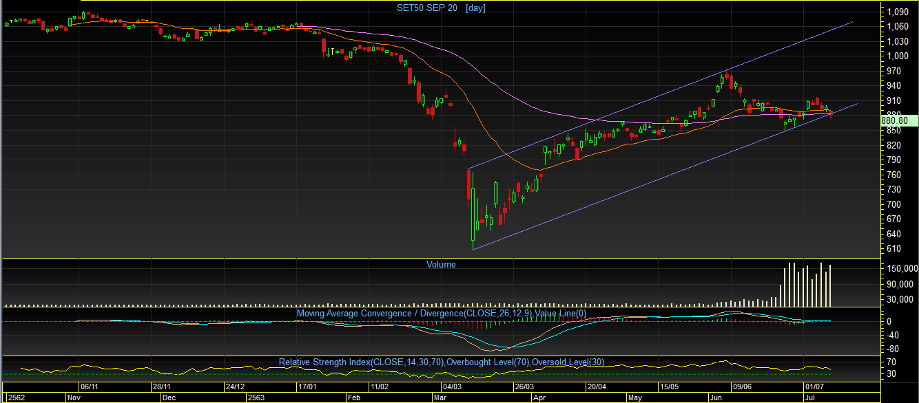 S50U20 TF Day: ตลอดทั้งสัปดาห์ที่ผ่านมา ดัชนีได้พยายามขึ้นไปยืนเหนือ 900 จุด แต่ท้ายที่สุด ก็ไม่สามารถผ่านขึ้นไปได้ และเผชิญกับแรงเทขายทำกำไรออกมาอย่างต่อเนื่อง จนทำให้ลงมาพักตัว ณ บริเวณเส้น Support line ซึ่งต้องมาดูกันว่า จะสามารถรับอยู่หรือไม่? ถ้าหากรับอยู่ ก็มีโอกาสที่จะ Rebound กลับขึ้นไปทดสอบ 900 จุดอีกครั้ง แต่ถ้าหากหลุด Support line ลงมา ก็เป็นไปได้ว่า จบ Pullback และยืนยันรูปแบบ Bearish Flag