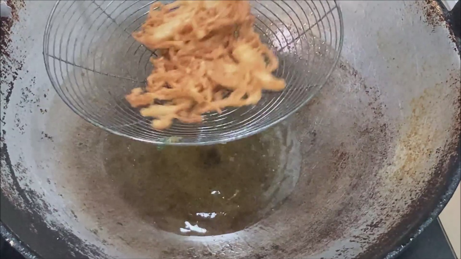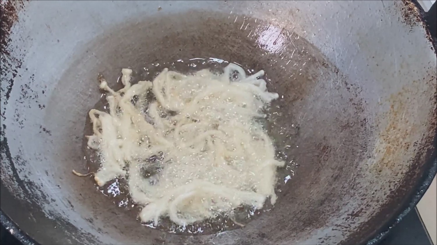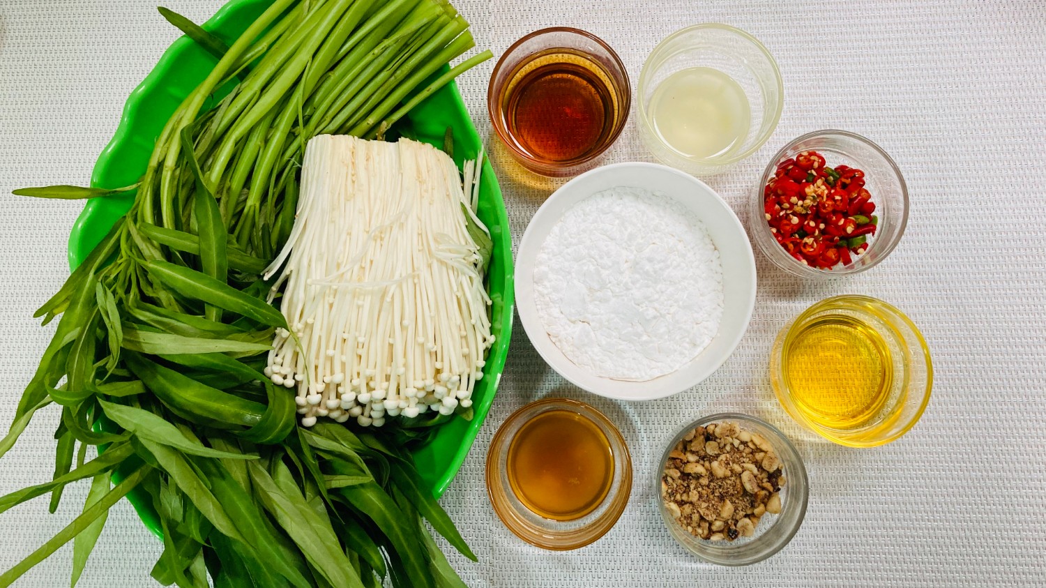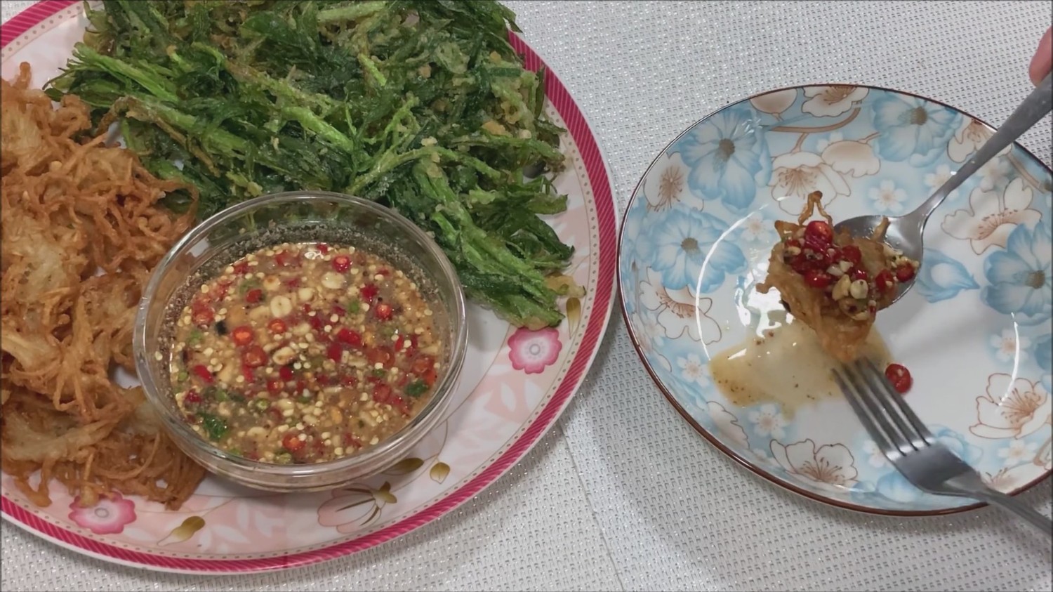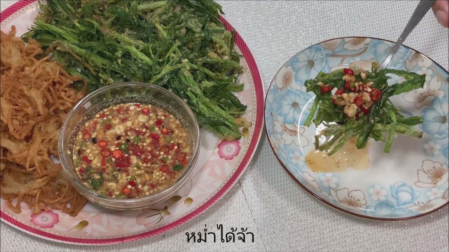 ยำผักบุ้งทอดกรอบ เห็ดเข็มทองทอดกรอบ น้ำยำรสเด็ด