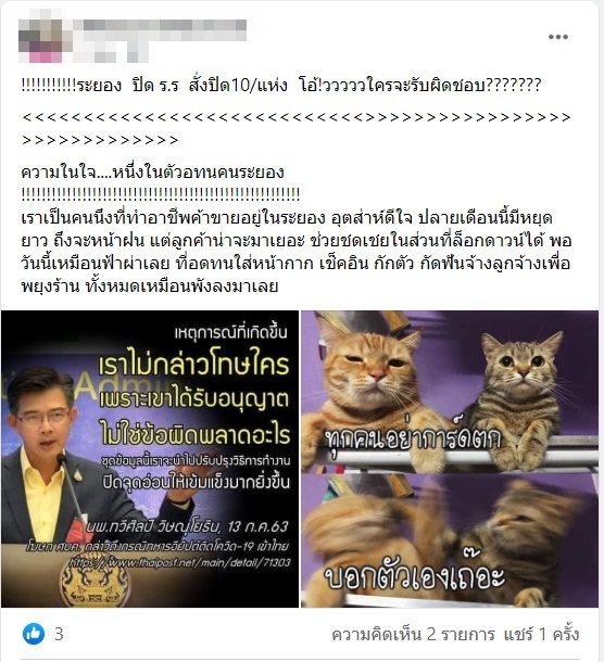 "เราเป็นคนนึงที่ทำอาชีพค้าขายอยู่ในระยอง อุตส่าห์ดีใจ ปลายเดือนนี้มีหยุดยาว ถึงจะหน้าฝน แต่ลูกค้าน่าจะมาเยอะ ช่วยชดเชยในส่วนที่ล็อกดาวน์ได้ พอวันนี้เหมือนฟ้าผ่าเลย ที่อดทนใส่หน้ากาก เช็คอิน กักตัว กัดฟันจ้างลูกจ้างเพื่อพยุงร้าน ทั้งหมดเหมือนพังลงมาเลย"