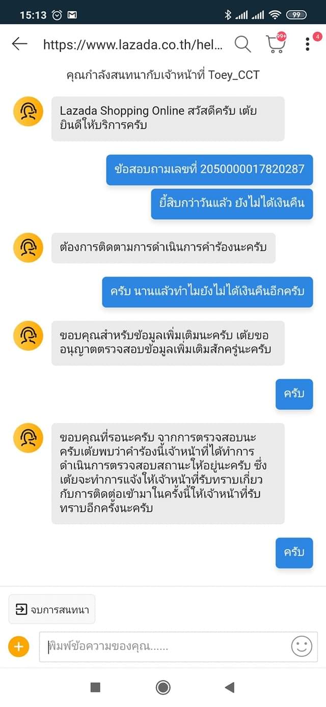 ได้ทำการซื้อสินค้าจากลาซาด้าจ่ายเงินผ่านวอลเลต แต่ได้ทำการยกเลิกการสั่งซื้อไป ได้เงินคืนมาในไม่กี่นาที จึงจะทำการถอนเงิน แต่กดถอนไม่ได้ แจ้งเจ้าหน้าที่ เจ้าหน้าที่แจ้งว่าจะต้องส่งหน้าบัญชีธนาคาร และ บัตรประชาชน มาให้ก่อนแล้วเจ้าหน้าที่จะทำการถอนเงินคืนให้ เราก็รีบทำตามไปในทันที เพราะต้องการเบิกเงินคืน แต่แล้ว เวลาผ่านไป 5วัน 7วัน 15 วัน 20วัน ที่ทวงถามไปในแต่ละครั้ง ก็จะได้คำตอบเดิมๆตามภาพ จนผ่านมาจะเดือนแล้ว วันนี้ก็ยังไม่ได้เงินคืน จึงอยากจะเตือนเพื่อนสมาชิกให้ระมัดระวัง ไม่จำเป็นจริงๆ อย่าคืนสินค้า อย่าเปิดใช้งานวอลเลต เพราะจะโดนบังคับคืนเงินผ่านวอลเลตเท่านั้น แล้วก็ต้องมานั่งรอเบิกเงินคืนอย่างไม่มีกำหนด หรือเอาง่ายๆ เลือกใช้บริการจากเจ้าอื่นดีกว่า