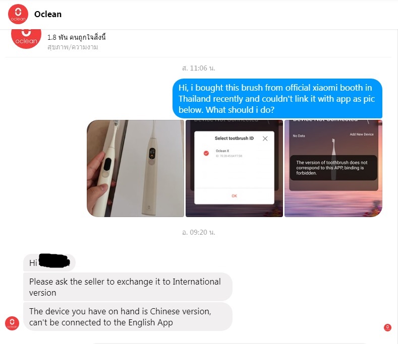 ขอเกริ่นก่อนว่าเราได้ทำการซื้อแปรงสีฟันไฟฟ้า Oclean มาจากบู้ทออกงานของ Xiaomi ที่ CTW ในช่วงปลายเดือนมิ.ย.ที่ผ่านมา ซึ่งหลังซื้อเราแค่ลองเปิดว่าใช้งานได้เท่านั้น แต่ยังไม่ได้เชื่อมกับ App Oclean เนื่องจากมือถือเม็มเต็มเลยกะจะเชื่อมตอนซื้อเครื่องใหม่แล้ว แต่ปรากฎหลังจากที่ลงแอพแล้วกลับเชื่อมไม่ได้ เลยแคปหน้าจอติดต่อไปถามที่เพจ Oclean (ภาษาอังกฤษแต่เป็นของบริษัทที่จีนเลยเพราะหาของไทยไม่เจอ) เค้าก็แจ้งว่าของเราเป็นเวอร์ชั่นจีนซึ่งมันเชื่อมกับแอพภาษาอังกฤษไม่ได้ เราต้องติดต่อคนขายที่ไทยเพื่อเปลี่ยนเครื่อง