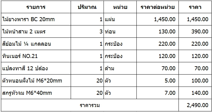 รายการวัสดุละราคา ทำเสร็จยังมีไม้เหลือขนาดประมาณ 1.65x0.4 เมตร และสีประมาณ ครึ่งกระป๋อง ถ้าคิดราคาค่าของจริง ๆ ต้นทุนน่าจะตกอยู่ที่ประมาณ 2,000 บาท