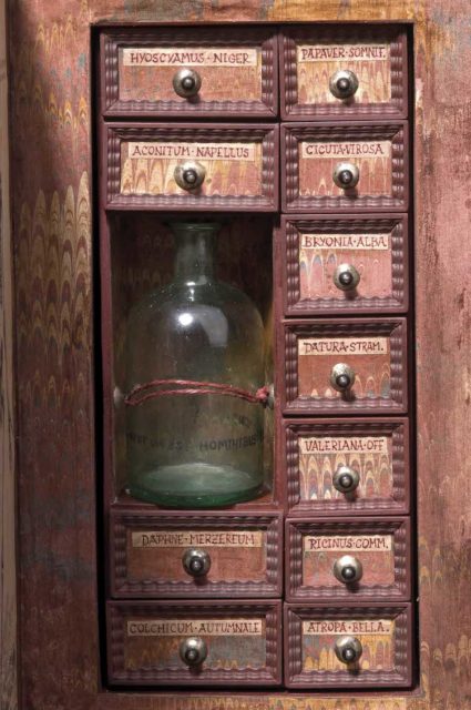 มันดูใหญ่โต ใครก็ตามที่คิดว่าหนังสือมีข้อความอยู่ด้านในนั้นคิดผิด ภายในหนังสือถูกสร้างขึ้นเป็น 11 ลิ้นชักทุกขนาดแตกต่างกันไป ด้านในของหนังสือเล่มนี้ดูประณีตบรรจงโดยแต่ละลิ้นชักมีขวดที่ทำจากแก้ว แม้ว่าขวดจะว่างเปล่าแต่ฉลากที่ติดอยู่กับลิ้นชักแต่ละใบที่มีขวดจะอธิบายถึงจุดประสงค์ในการใช้ หนังสือกลวงนี้จะเป็นคลังแสงของนักฆ่าที่มีสมุนไพรที่เป็นพิษ หรือเป็นสมุนไพรสำหรับการใช้ที่แตกต่างกันในหมู่หมอและผู้ปฏิบัติงานทางการแพทย์เมื่อหลายศตวรรษก่อน ก็ไม่อาจรู้ได้