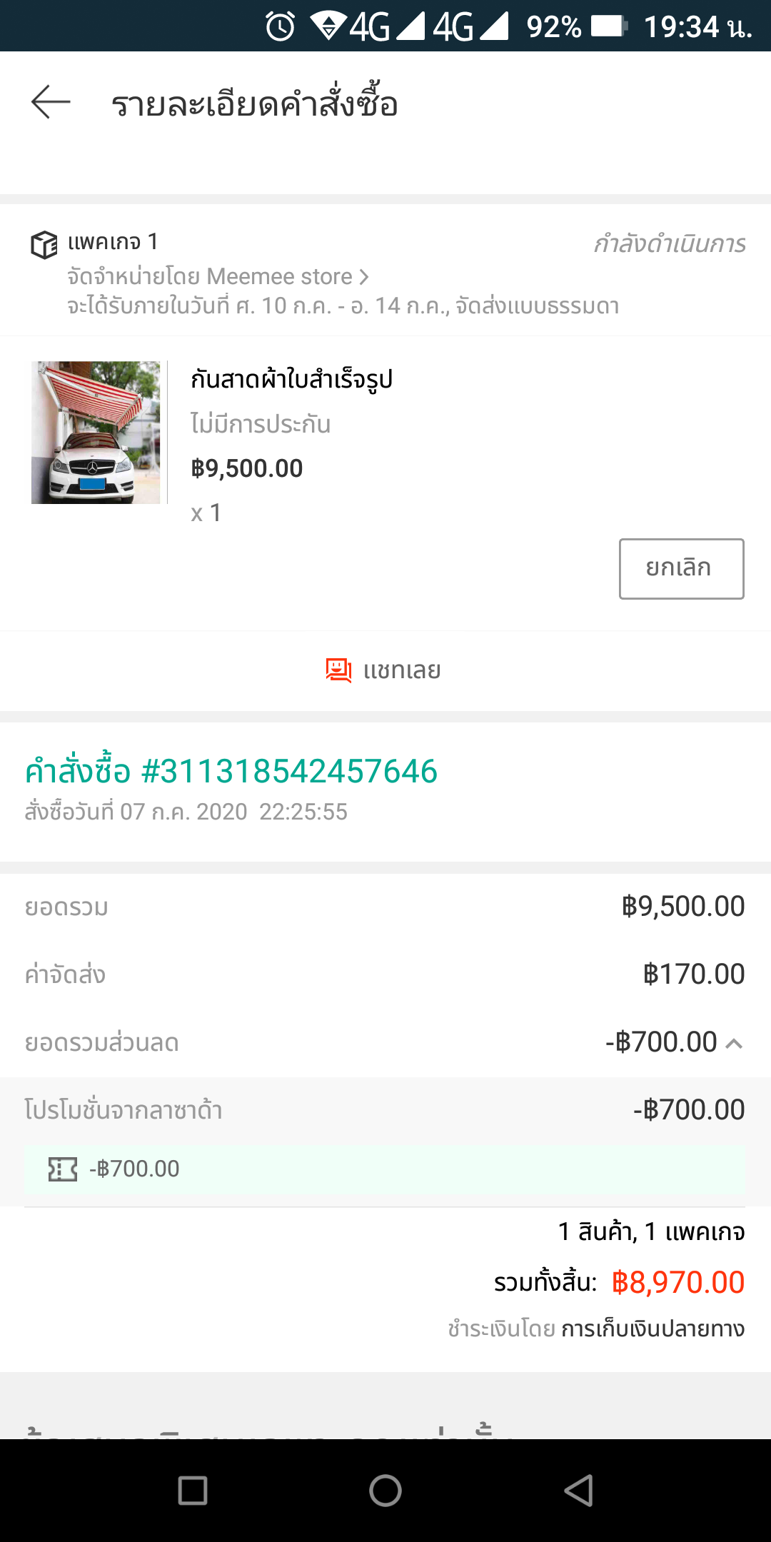 สั่งซื้อสินค้าวันที่ 29 มกราคม 2566 ราคา 328฿ ค่าจัดส่ง 38฿ ใช้คูปองส่วนลด 30% สูงสุด 100฿ ลดไป 98.40฿ ใช้เงินคืนสะสมลดไป 17.57฿ รวมชำระ 250.03฿ มาวันนี้ร้านค้ายกเลิกสินค้าเรา จึงติดต่อ