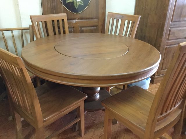 คิดไปคิดมาจัดไปจัดมา ก็มาตกม้าตายกับโต๊ะกลมหมุนค่ะ เป็นไม้สักอย่างดี (ตามคำพูดของคุณแม่ แต่เราดูไม่ออกหรอก) 4 ที่นั่งขนาดใหญ่ซึ่งคุณพ่อกับคุณแม่ไม่ยอมให้โล๊ะขายค่ะ คือตอนแรกคุณพ่อก็ยอมๆ แหละเมื่อประมาณ 1-2 ปีที่แล้ว เพราะเรารู้สึกว่าบ้านก็เล็กแค่นี้แต่เอาแบบนี้มาใช้กับก็ไม่ใช่ (คุณแม่ซื้อต่อมาจากน้าสาวค่ะ น้าสาวกับแฟนของน้าเปิดร้านเฟอร์นิเจอร์ ท่านไปเยี่ยมและไปเจอมาถูกใจเลยซื้อค่ะ) แต่หลังจากที่คุณพ่อนั่งซ่อมตัวหมุนด้านบน (ตอนแรกหมุนฝืดมาก) ท่านก็เปลี่ยนใจไม่ยอมขายแล้วค่ะ แต่ทุกวันนี้ไม่ได้ใช้นะคะ ยกไปไว้ที่เก็บของมีอย่างอื่นมาทับเต็มเลย ทุกวันนี้กินข้าวกันบนโต๊ะโซฟาค่ะ