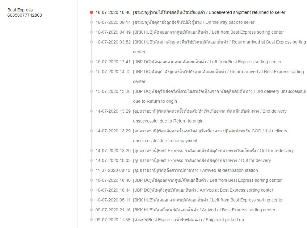 ผมสั่งสินค้าจาก shopee สินค้ามาถึงปลายทาง ตามวันที่ระบุไว้ในระบบว่า จะได้รับวันที่ 11/7/2020 แต่ขนส่ง Best Express กลับไม่ส่งสินค้า โทรตามสินค้ากับขนส่งในพื้นที่ ตั้งแต่วันที่มาถึง ได้รับคำตอบ สินค้าจะถึงลูกค้าไม่เกิน 18.00 น. นั่งรอจนจะถึง 18.00 โทรตามอีกครั้ง ได้รับคำตอบ ขนส่งจะหมดเวลาทำการแล้ว ตรวจสอบให้ไม่ได้ ถ้าไม่ได้รับของ จะส่งให้อีกครั้ง ในวันที่ 13/7/2020 เราก็เป็น งง พอวันที่ 13/7/2020 ตามอีกครั้ง บอก ให้รอการจัดส่ง ของเยอะ ส่งไม่ทัน รอจนถึงวันที่ 14/7/2020 ก็ยังไม่มีการจัดส่ง จึงโทรไปที่ขนส่งในพื้นที่ว่า ถ้าไม่มีเวลาจัดส่ง ก็ให้ตีคืนสินค้ากลับไปได้เลย แล้วได้โทรติดต่อกับผู้ขายเรียบร้อยว่า ขนส่งไม่ยอมจัดส่งสินค้า จึงต้องขอยกเลิก