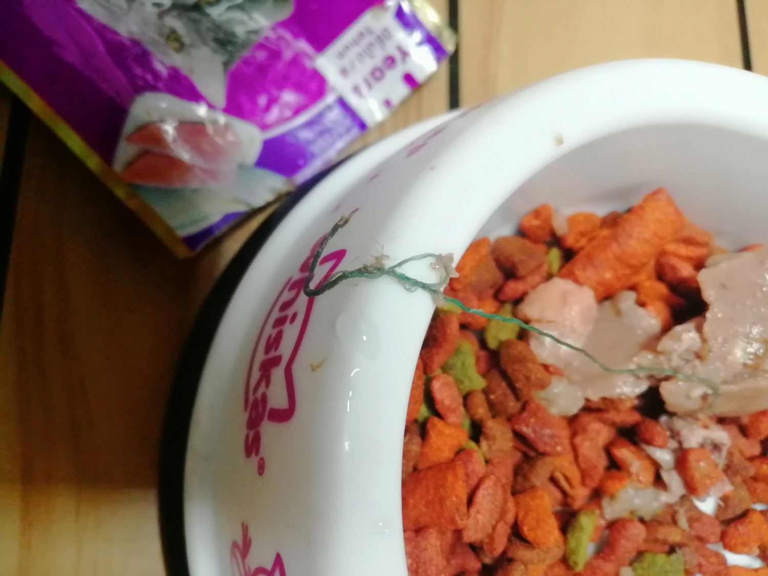 วันนี้ดันอยากรู้ว่ามีส่วนผสมอะไรในอาหารเปียก สีเขียวเด่นมาเชียว เลยลองหยิบขึ้นมา ก็สงสัยคงเป็นผักแต่ยาวจัง เลยลองดึงๆดู เท่านั้นแหละค่ะ