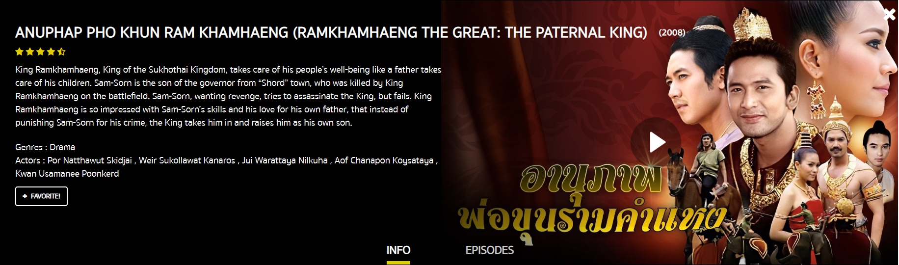 เรื่องย่อ : พ่อขุนรามคำแหง (ณัฐวุฒิ สกิดใจ)  พระมหากษัตริย์แห่งอาณาจักรสุโขทัย ผู้ทรงดูแลความเป็นอยู่ของราษฎรทุกชนชั้นอย่างพ่อปกครองลูก วันหนึ่งพระองค์ถูกสามศร (ศุกลวัฒน์ คณารศ)ลูกชายเจ้าเมืองฉอดลอบฆ่า เพื่อล้างแค้นแทนพ่อที่ถูกพ่อขุนรามฆ่าตายกลางสนามรบ พระองค์เห็นสามศร เป็นผู้มีฝีมือ อีกทั้งยังกตัญญู จึงไม่เอาผิดและเลี้ยงดูเหมือนลูกคนหนึ่ง