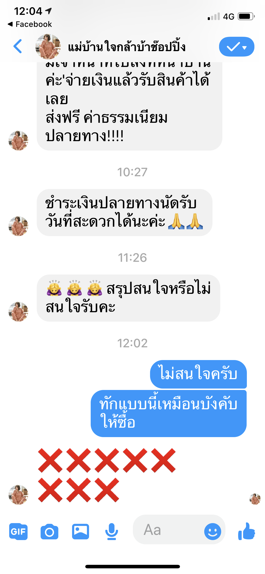 เราถามใน Comment ว่ามีกี่สี อยู่ ๆ ก็ทักมาในข้อความส่วนตัว ยังไม่ทันมีเวลาดู แม่ค้าก็ทักมาแบบนี้ จะ Block ก็ไม่ได้ เพราะซื้อโฆษณามาใน FB