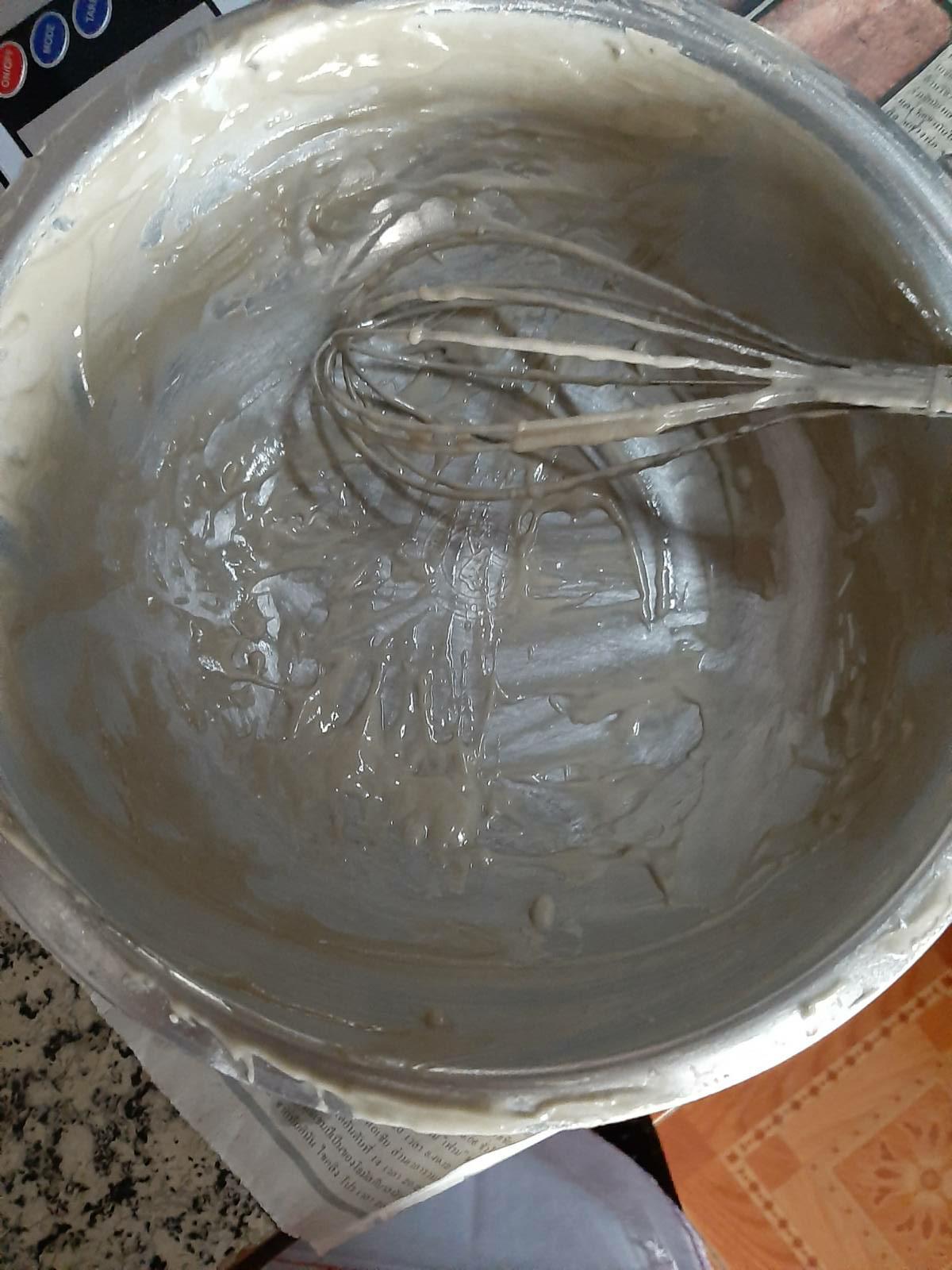 เริ่มแรกเราผสมน้ำตาล+ไข่ ตอนแรกส่วนผสมปกติดีแต่คนไปนานส่วนผสมกลายเป็นสีน้ำตาลเข้ม หลังจากนั้นนำเนยจืดแข็ง+เกลือใส่ลงไป มันก็กลายเป็นสีเทาเลยค่ะ
