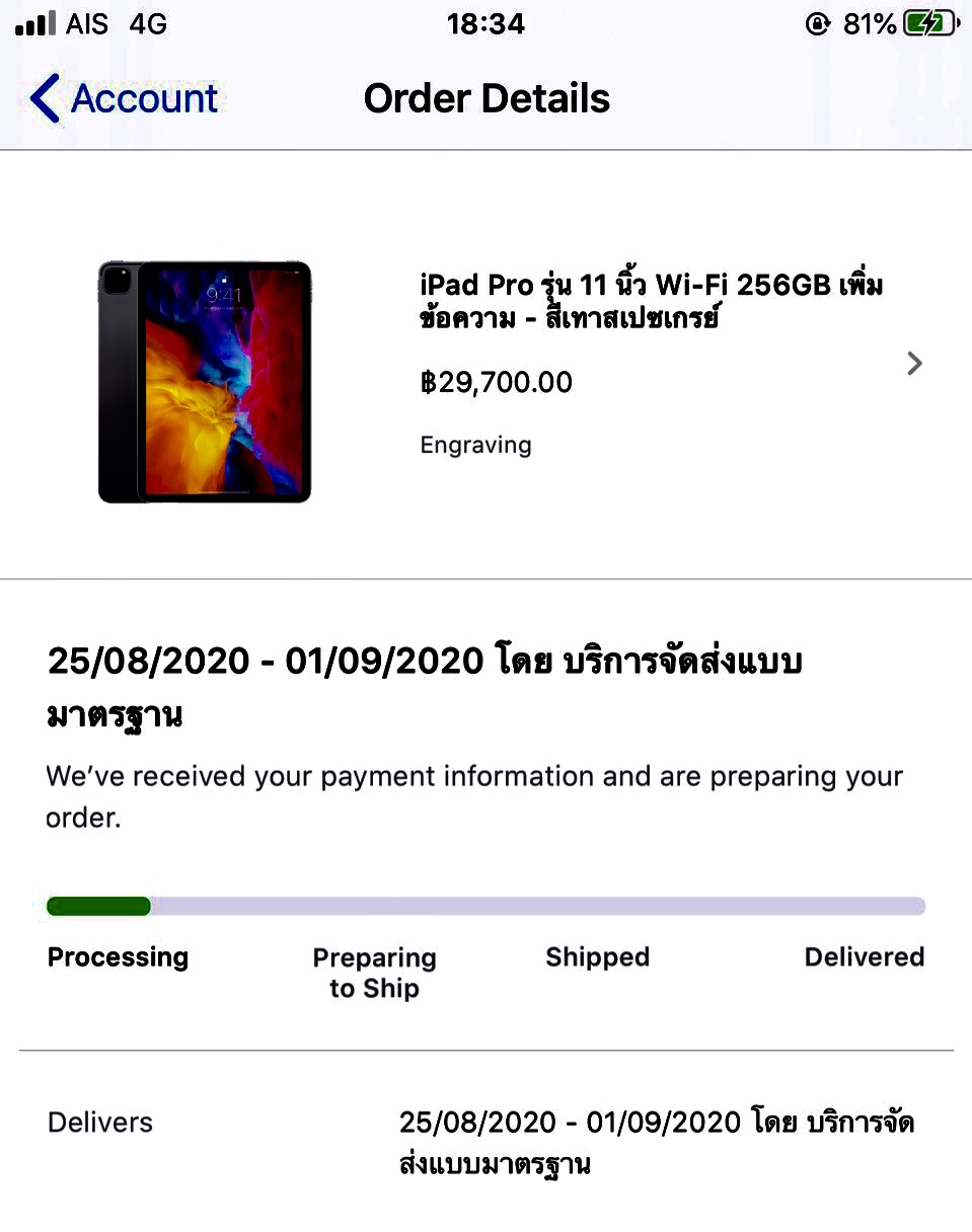 คือผมได้สั่ง ipad pro 2020 ไปวันที่ 13/7/020 เเล้วผมดูวันที่เขาจะจัดส่งคือวันที่1/9/2020 ผมอย่ากรู้ว่ามีนานกว่านี้อีกไหม555 เเต่รู้สึกว่า apple pencil จะมาก่อนค