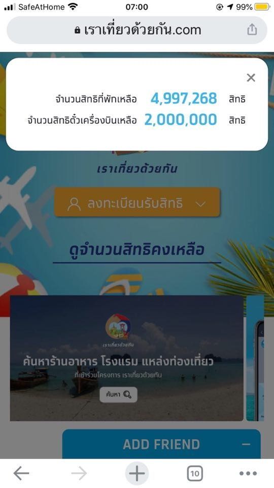 หลังจากเปิดให้จองสิทธิ์ที่พักเมื่อเวลา 06.00 น. ที่ผ่านมา พบว่าเมื่อเวลา 07.00 น. มีผู้ขอสิทธิ์ที่พักไปแล้วกว่า 2,732 คน ส่งผลให้จำนวนสิทธิ์ที่พักคงเหลือ 4,997,268 สิทธิ์