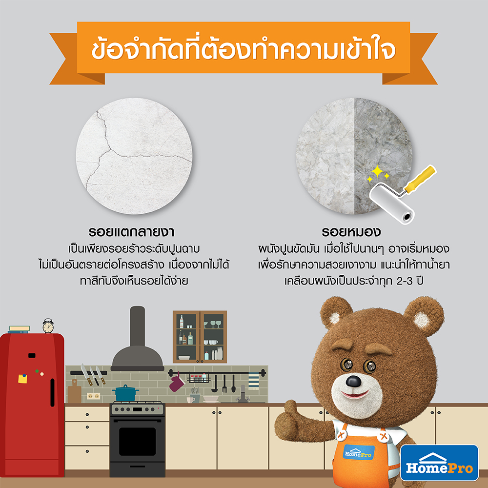 ผนังปูนขัดมัน เมื่อใช้ไปนานๆ อาจเริ่มหมอง เพื่อรักษาความสวยเงางาม แนะนำให้ทาน้ำยาเคลือบผนังเป็นประจำทุก 2-3 ปี