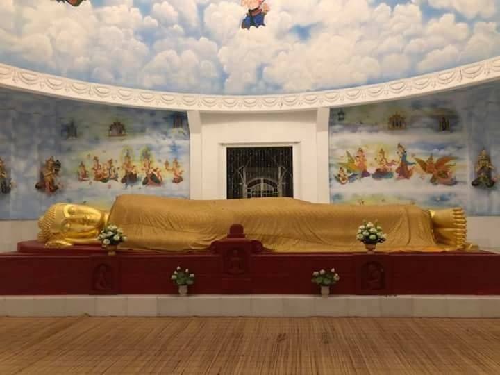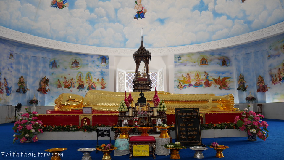พระพุทธรูปปางปรินิพพาน วัดพระปฐมเจดีย์ ราชวรมหาวิหาร จังหวัดนครปฐม พระพุทธรูปอยู่ในพระอิริยาบถบรรทมตะแคงขวา หลับพระเนตร พระเศียรหนุนพระเขนย(หมอน) พระหัตถ์ซ้ายทอดทาบไปตามพระวรกาย พระหัตถ์ขวาวางหงายอยู่ข้างพระเขนย พระบาทซ้ายทับซ้อนพระบาทขวา