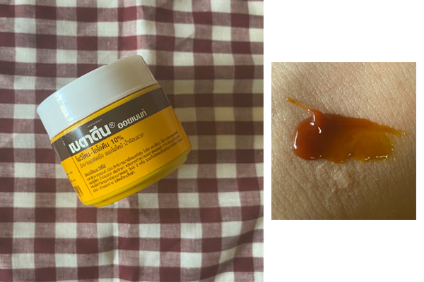 เบตาดีนแบบขี้ผึ้งกระปุกครับ ใช้งานง่ายกว่าแบบน้ำมากๆ และคุณสมบัติในการรักษาแผลก็ไม่ต่างจากแบบน้ำที่ใช้เลยครับ ตัวนี้ผมเห็นสาวเขาฮิตใช้รักษาสิวอักเสบกันอยู่ช่วงหนึ่งด้วย ร่ำลือกันว่าใช้แล้วสิวยุบหายไวมาก แต่ผมไม่ได้เอามารักษาสิวนะครับ เอามาใช้ทาแผลบนหน้าให้มันหายไวๆ ใช้คัตตอนบัตป้ายๆเกลี่ยๆ ทาแบบบางๆและเน้นทาบ่อยๆทุกวันเลย แอบกลั้นใจตอนใช้นิดหนึ่งเพราะกลิ่นมันเหม็นๆไม่ต่างจากเบตาดีนแบบน้ำ แต่ว่าล้างออกง่ายครับ ล้างน้ำเปล่าเพียวๆก็ออกแล้ว และดีตรงใช้แล้วไม่แสบหน้ามากกว่าเดิมด้วย