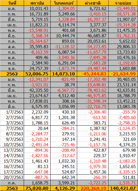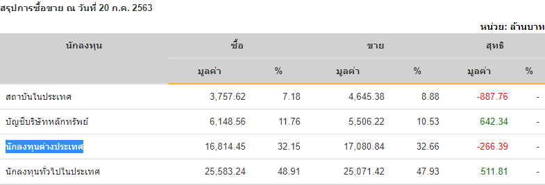 Sinthorn Summary 20/7/2563 : ต่างชาติขายสุทธิ -266.39 ลบ.