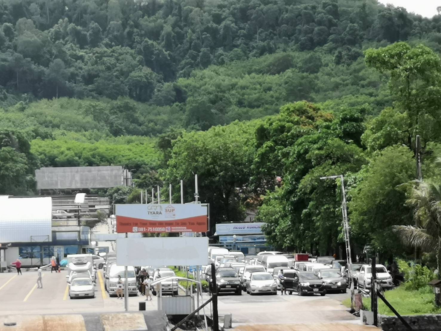 ออกมาจากจันทบุรีได้ไม่นาน ก็มาถึงท่าเรืออ่าวธรรมชาติ ประมาณบ่ายโมง และก็เป็นไปดั่งคาดหมายเราก็ได้พบเจอการจราจรสุดแสนสาหัสที่ท่าเรือที่รถติดยาวมาก จากท่าเรือขดเป็นงูและหางแถวก็ยังอยู่ห่างไปอีกสามกิโลเมตร เอายังไงล่ะทีนี้ เราเลยตัดสินใจเปิดไฟขอทางหาที่จอดฝากรถในทันใด