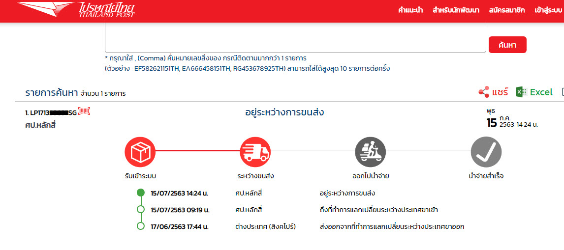 พัสดุจากจีน เข้าระบบวันที่ 15 แล้วก็ค้างเลย โทรตาม ศป.หลักสี่บอกปิดถุงส่งออกไปแล้ว โทรตาม ปณ ปลายทาง บอกของไม่เข้ามา ให้โทร 1545 ขอเปิดสอบสวน แต่โทรยังไงก็ไม่มีคนรับ โทรรอบหนึ่งรอเกือบ 15-20 นาทีก็ไม่