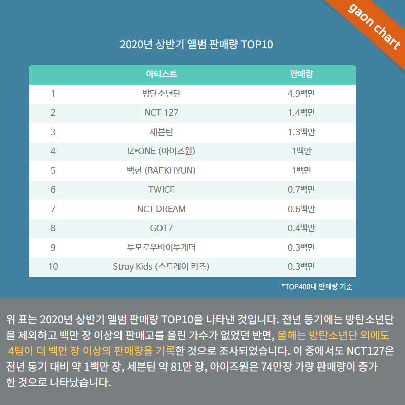 Top10 ศิลปินที่มียอดขายอัลบั้ม (GAON) สูงที่สุดในครึ่งปีแรกของปี 2020