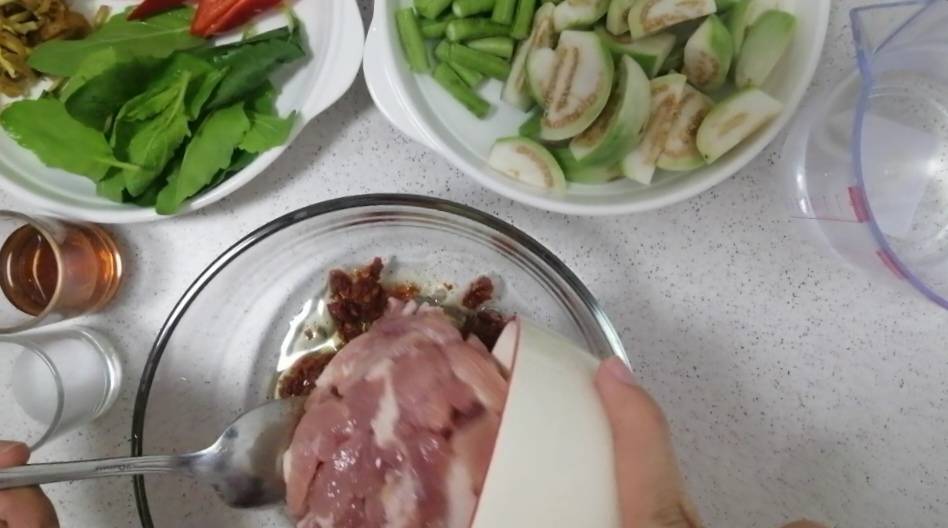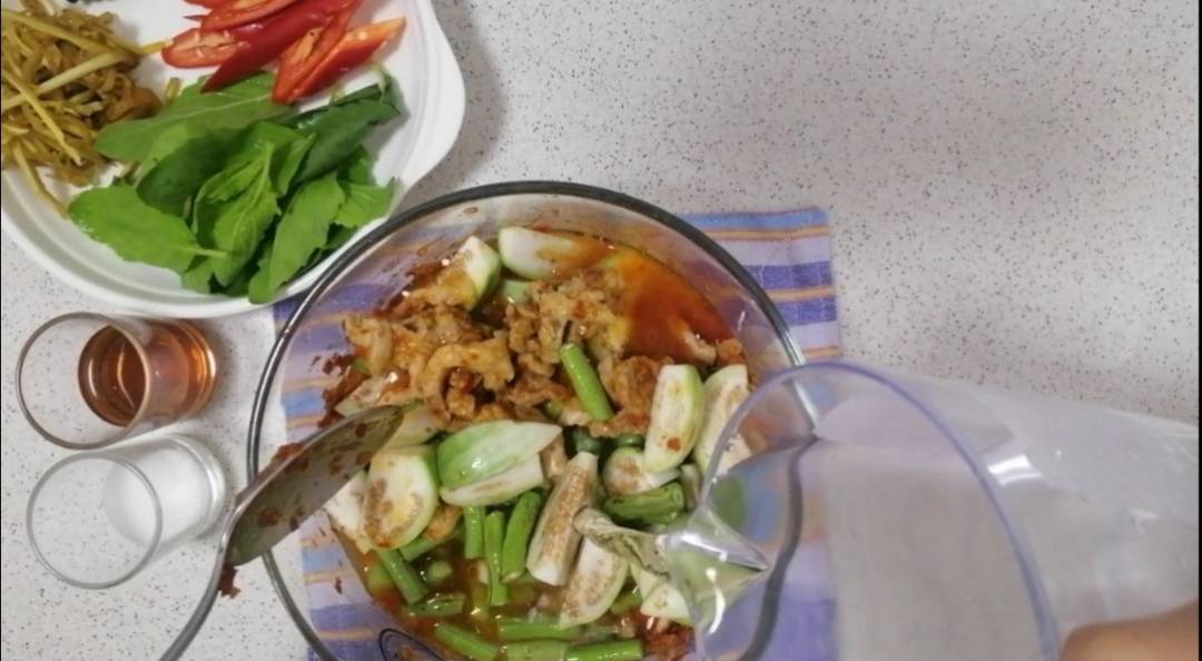 ให้นำออกมาใส่เครื่องทุกอย่างลงไป เริ่มจาก มะเขือเปราะ มะเขือพวง ถั่วฝักยาว แล้วเติมน้ำเปล่าลงไป