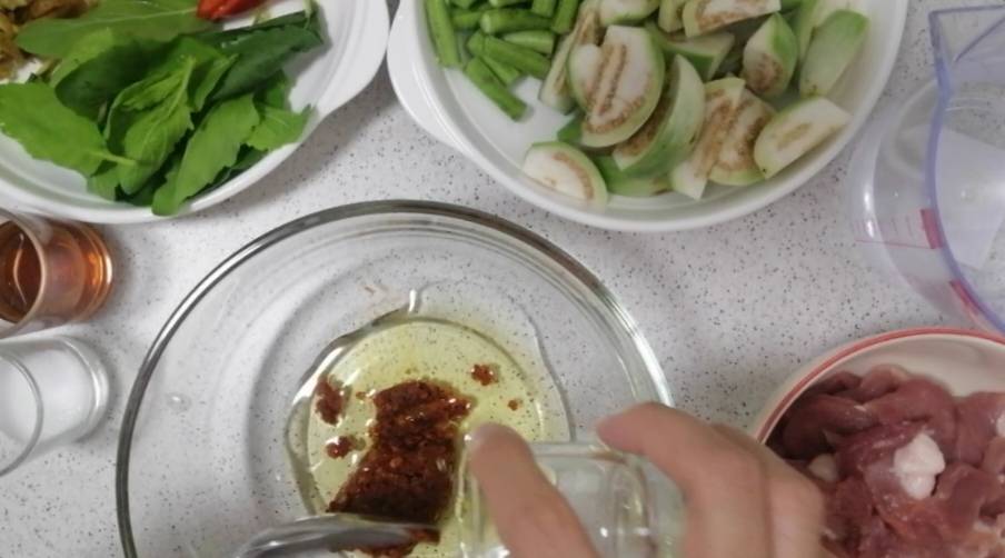 ขั้นตอนการทำเริ่มจากน้ำพริกแกงเผ็ดใส่ภาชนะที่สามารถเข้าไมโครเวฟได้ แล้วตามด้วยน้ำมันพืช และเนื้อหมู