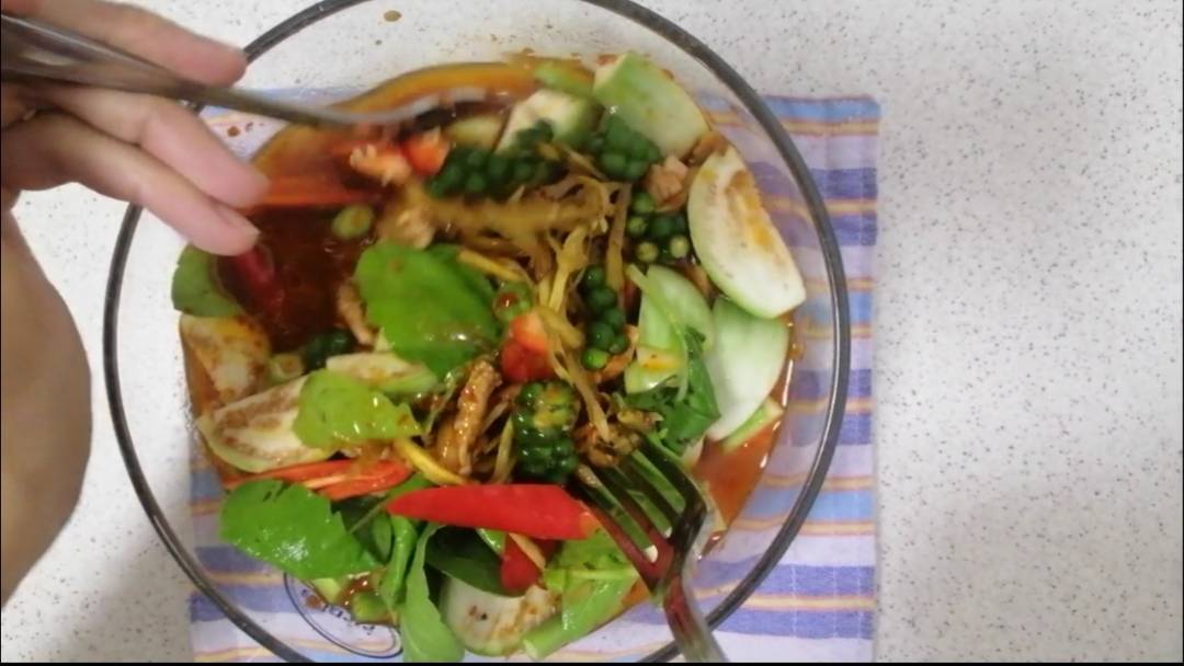 ปรุงรสด้วยน้ำปลา น้ำตาล แล้วทำการใส่กระชายซอย พริกซอย พริกไทยสด และใบกะเพราลงไป